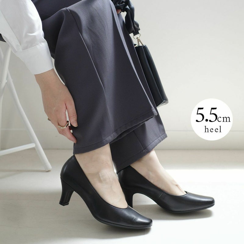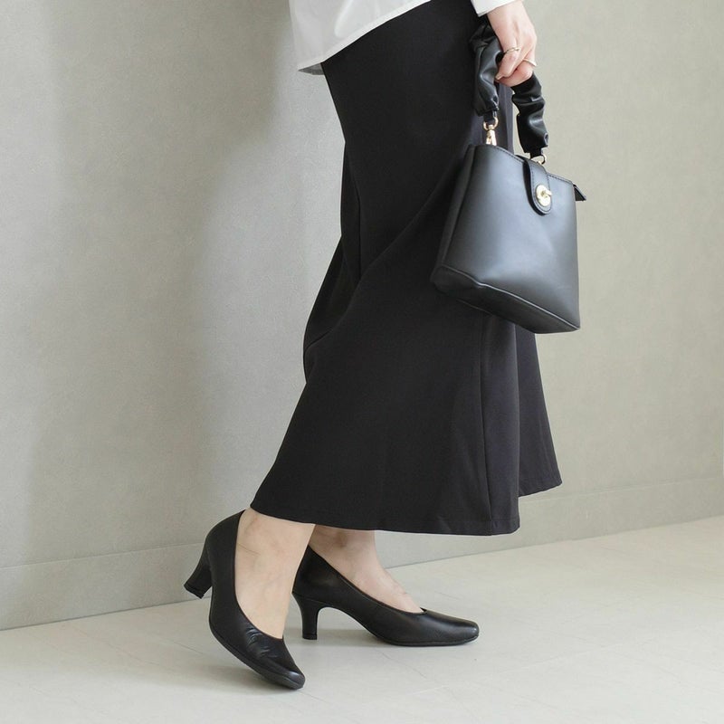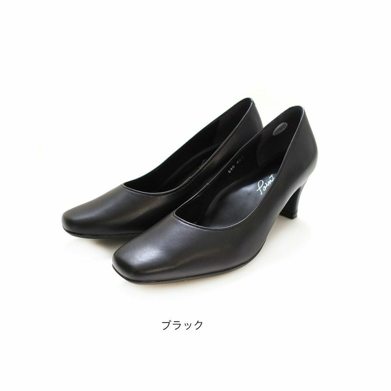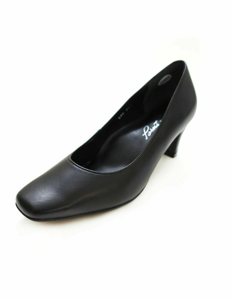 落ち着いた印象のスクエアトゥはお仕事からお出かけまで幅広く活躍中敷はアーチクッション入りで抗菌消臭効果あり。