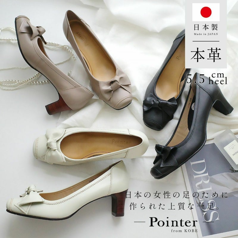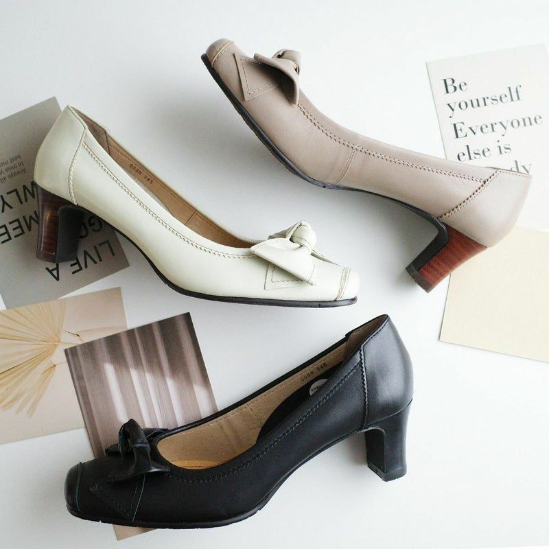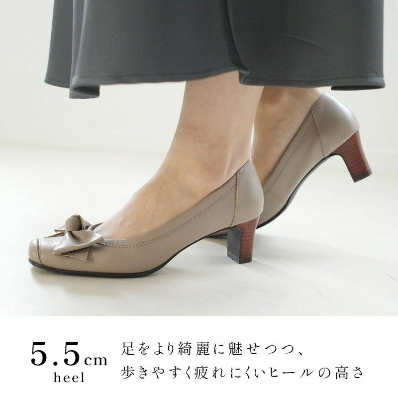 足をすらっと綺麗に見せる。5.5cmヒールの本革リボンパンプス。