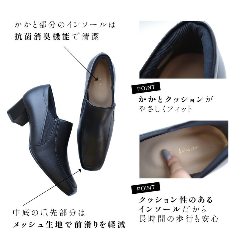 通勤や冠婚葬祭、抗菌消臭加工でどんな時でも快適&安心。両サイドに深めに入ったスリットにゴムを使用し、脱ぎ履きをよりスムーズに。