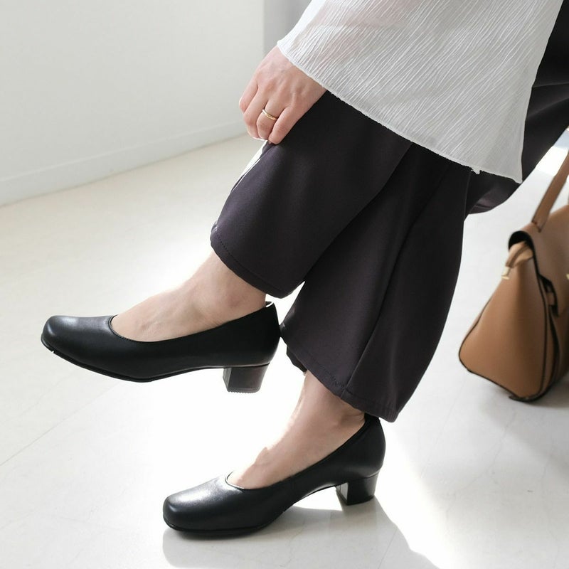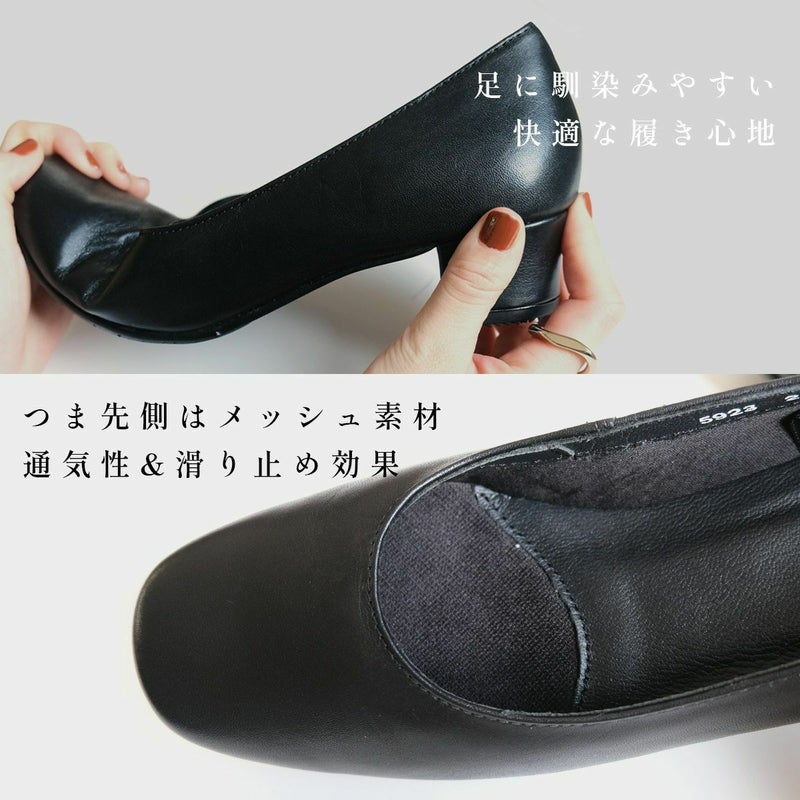 足が疲れにくい高さでありながら、オフィスやフォーマルに対応できます。中敷のかかと側は本革を仕様。つま先側はメッシュ素材で通気性と滑り止め効果があります。
