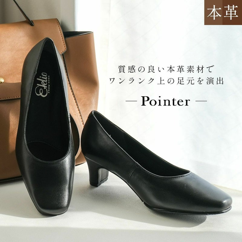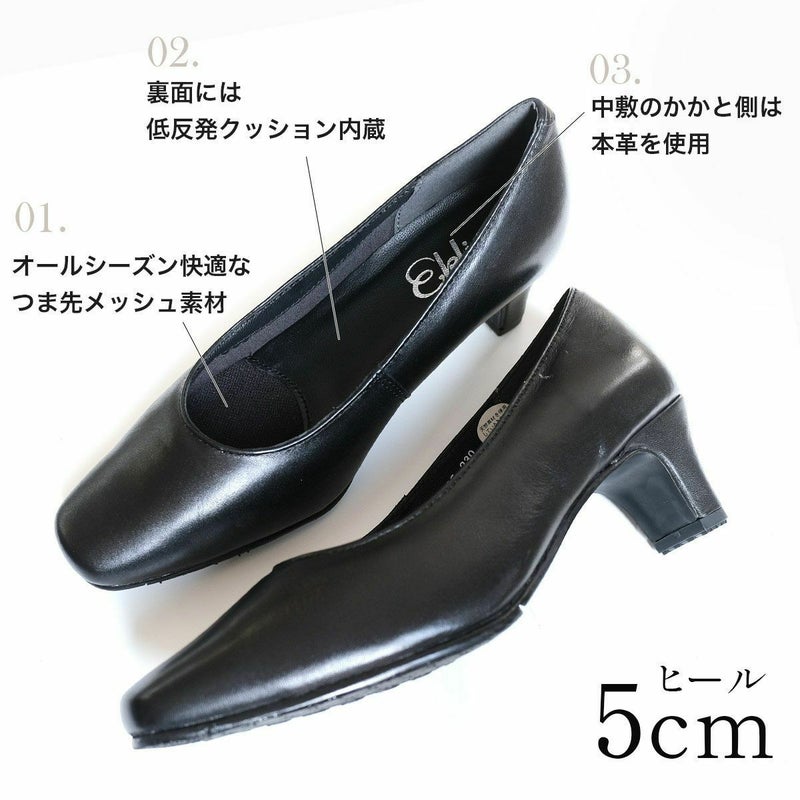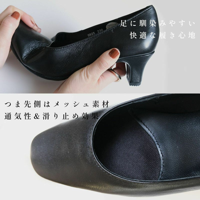 高すぎず低すぎない5cmヒールが、美脚と歩きやすさを両立しました。中敷のかかと側は本革を仕様。つま先側はメッシュ素材で通気性と滑り止め効果があります。