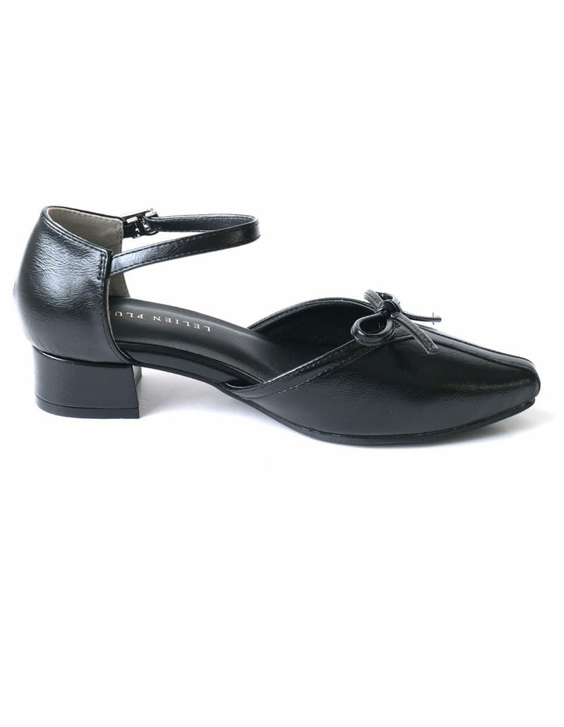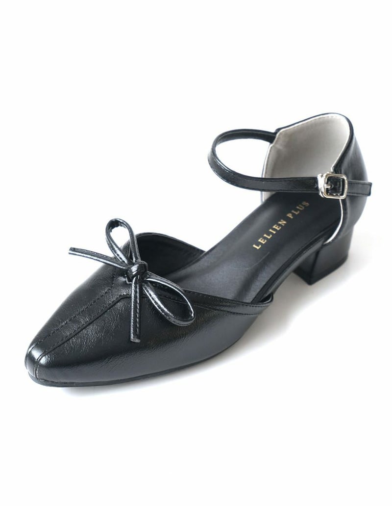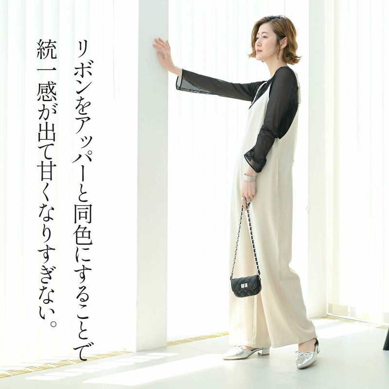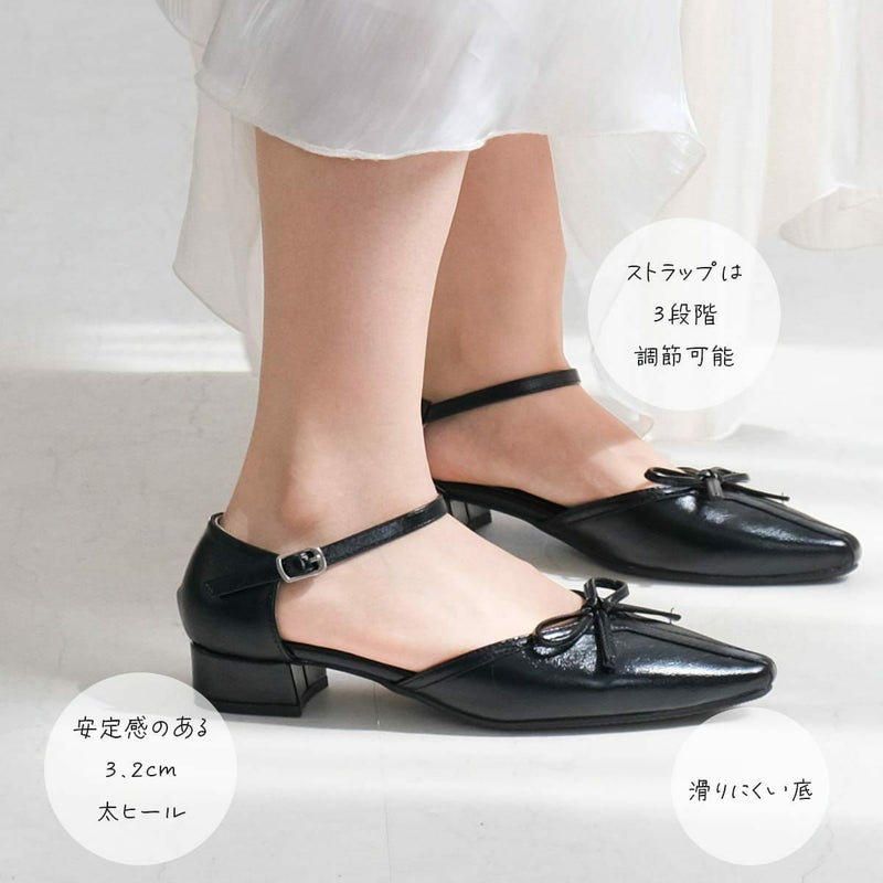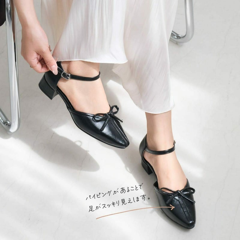 太ヒールと滑りにくい底で安定感があり、調節可能なストラップ付きパイピングですっきり見え、同色のリボンが甘さを抑えた上品な印象に。
