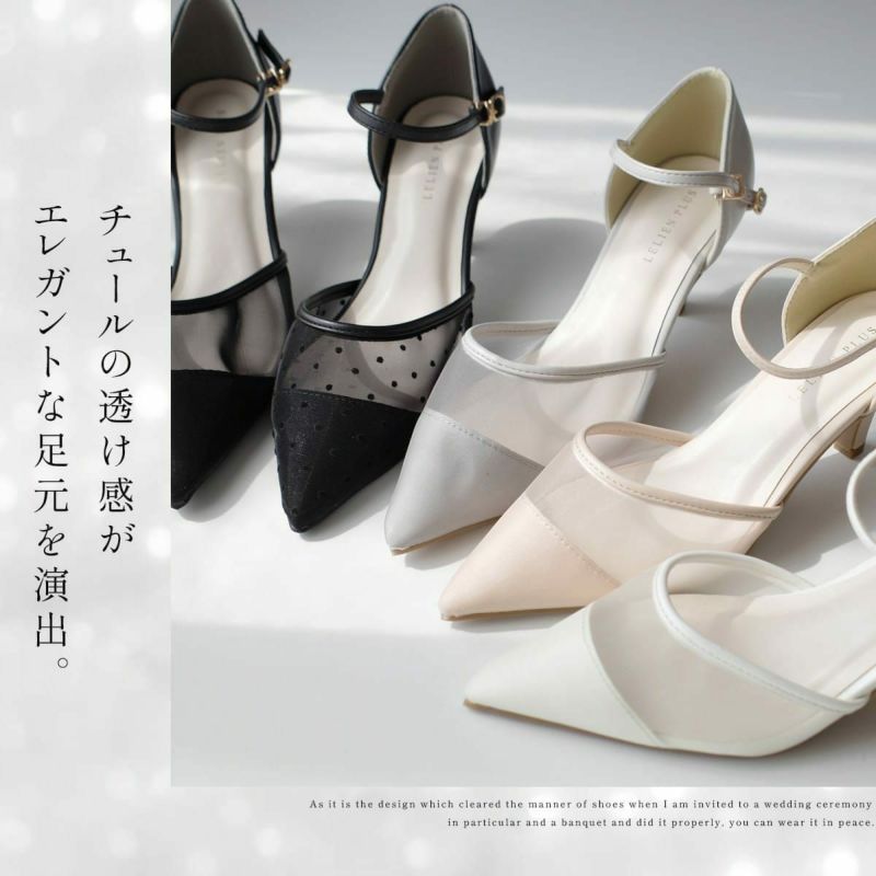 つま先・かかとが隠れた6.5cmの細いヒールで、チュールの透け感がエレガントな足元を演出します。結婚式や披露宴にお呼ばれした時の靴のマナーをきちんとクリアしたデザインなので、安心して履いていただけます。