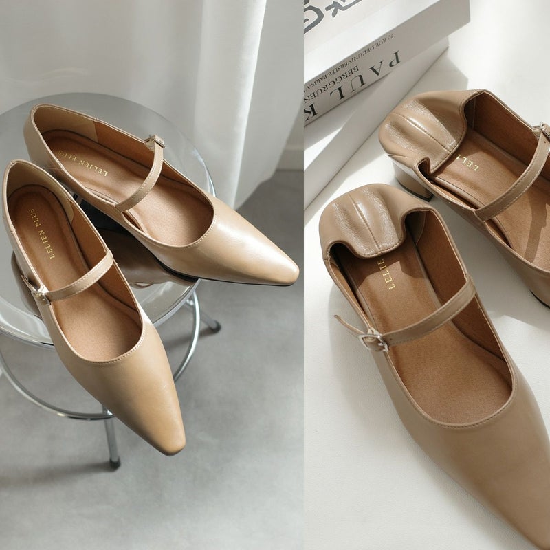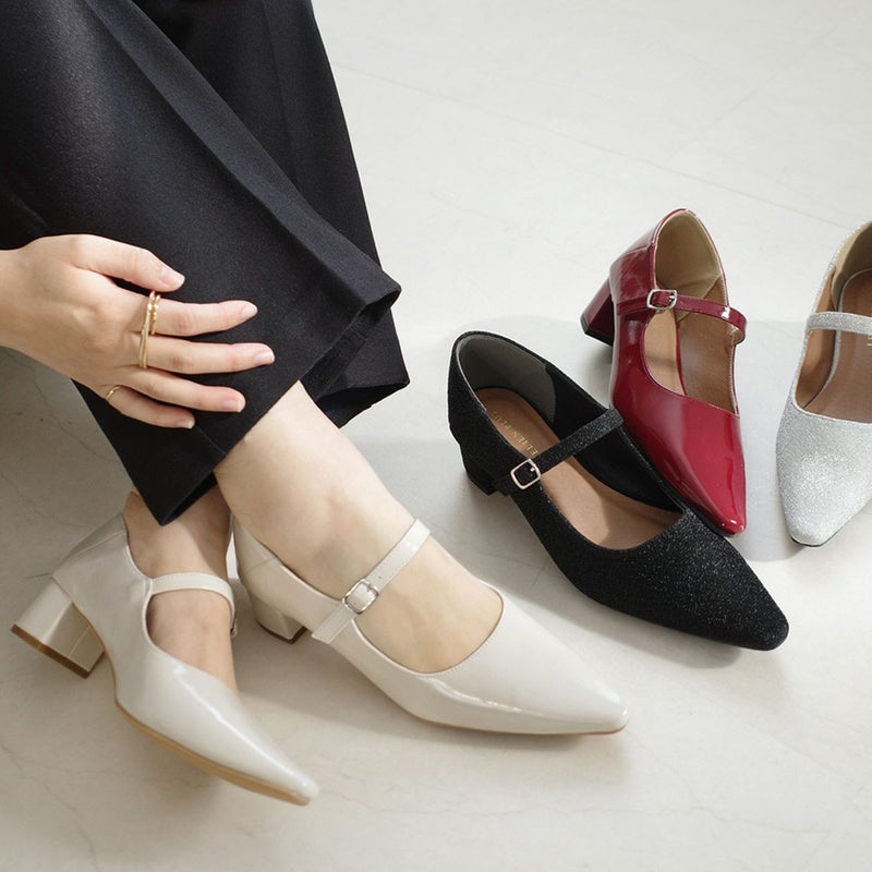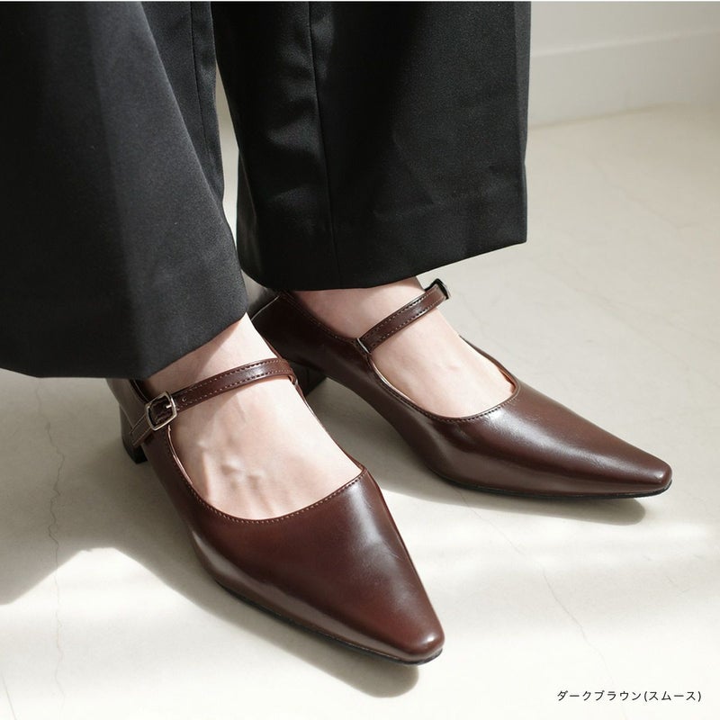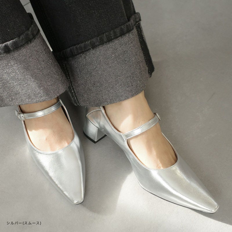 細ストラップが華奢見えな、つま先が尖ったメリージェーン