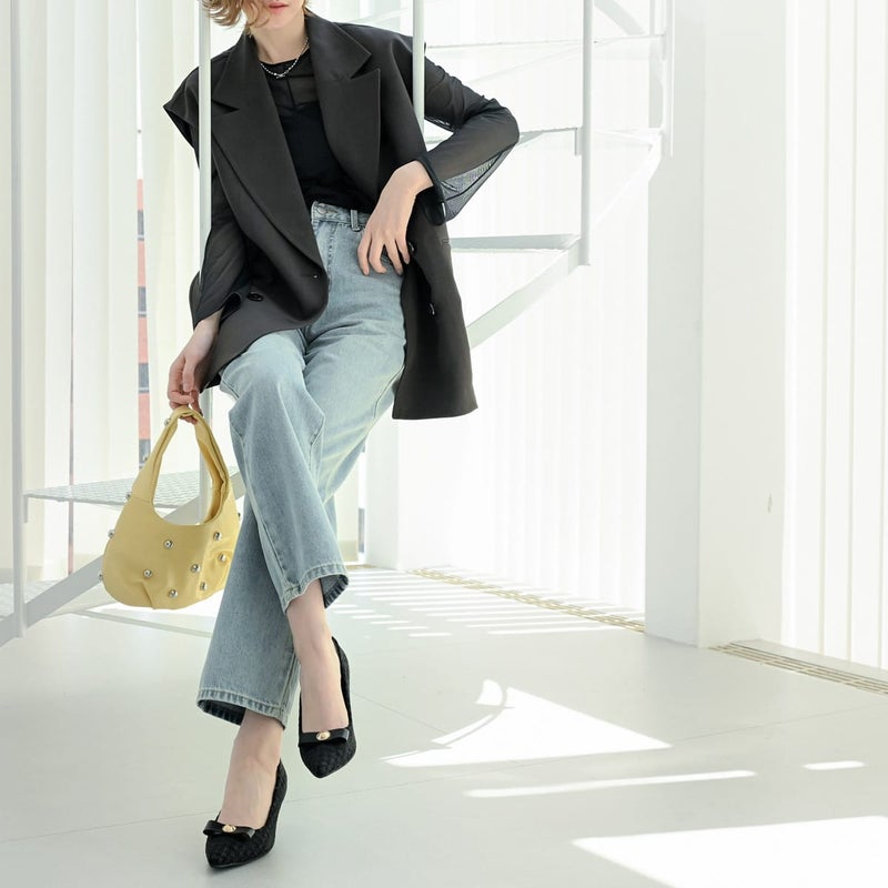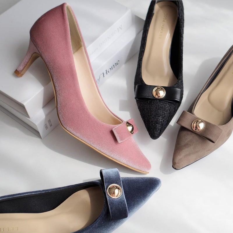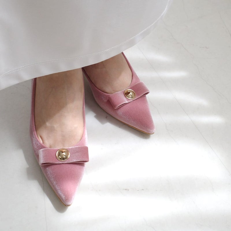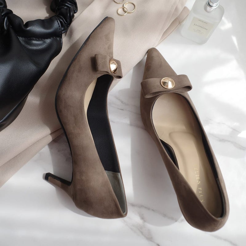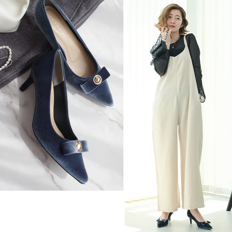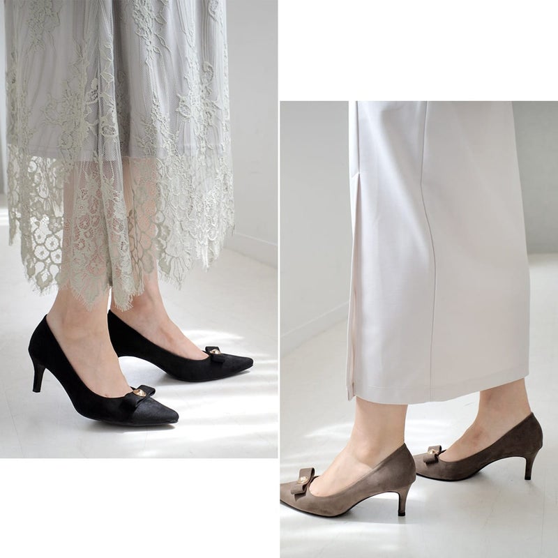 甘すぎないリボンモチーフで大人可愛い仕上がりに。ポインテッドトゥと細めヒールが、足をすっきりと美しく見せてくれます。