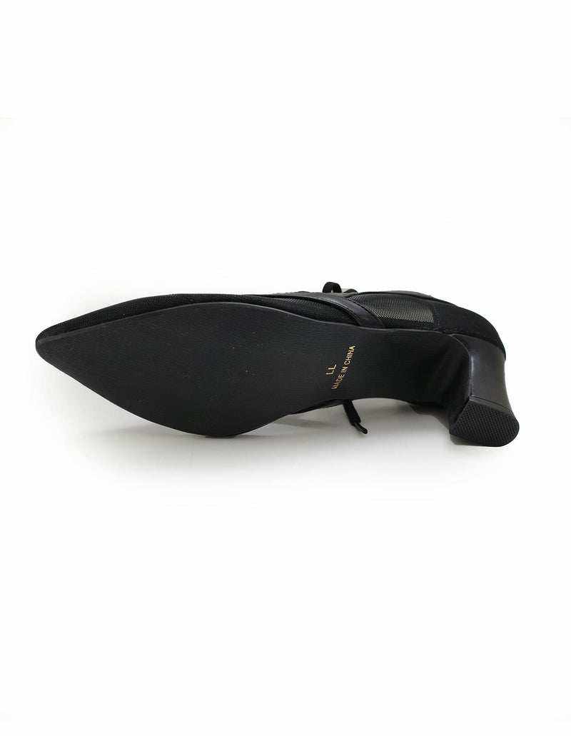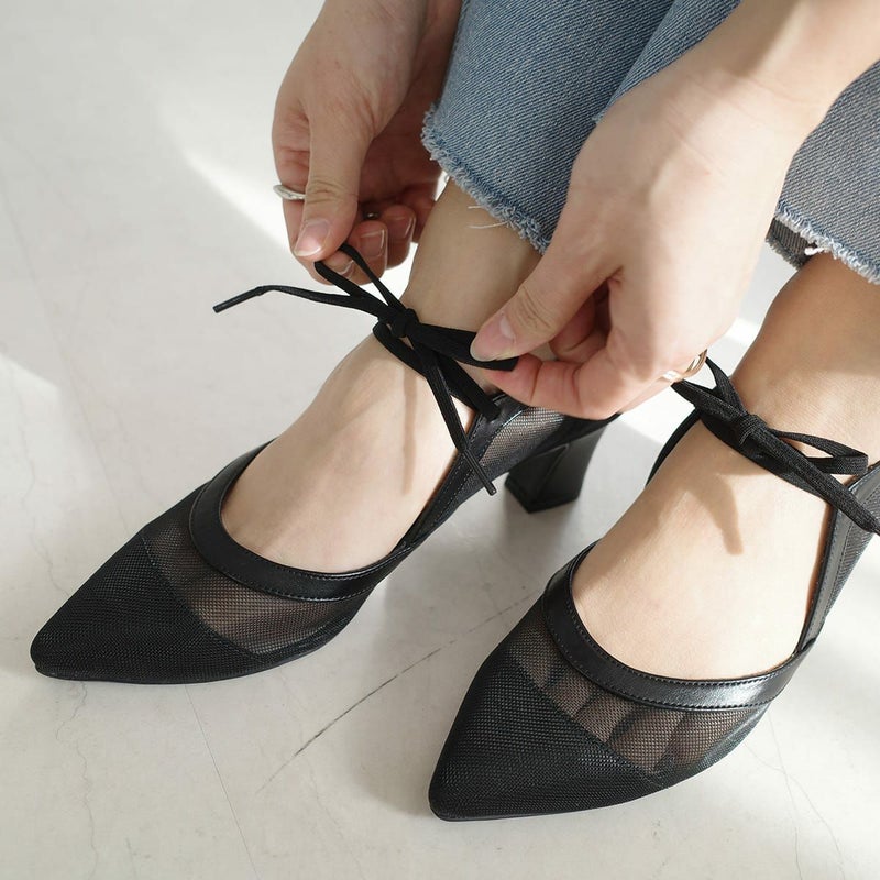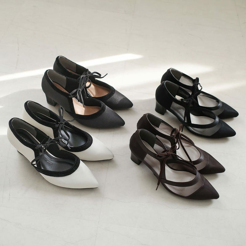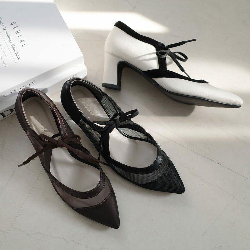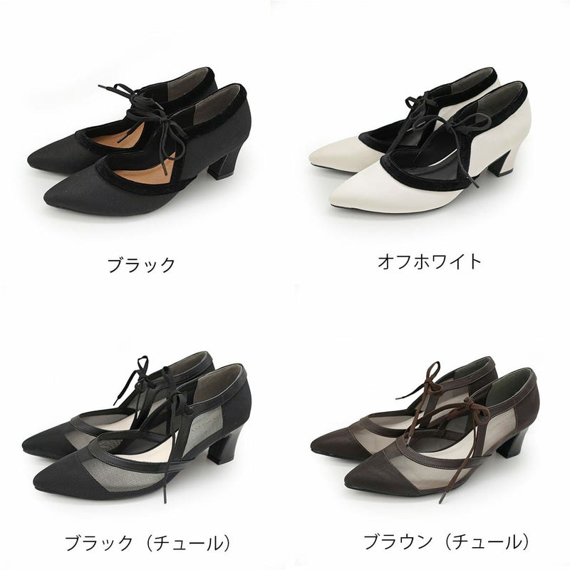 ポインテッドトゥパンプスチュールリボンチャンキーヒール レディース