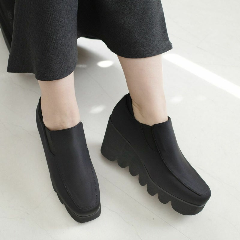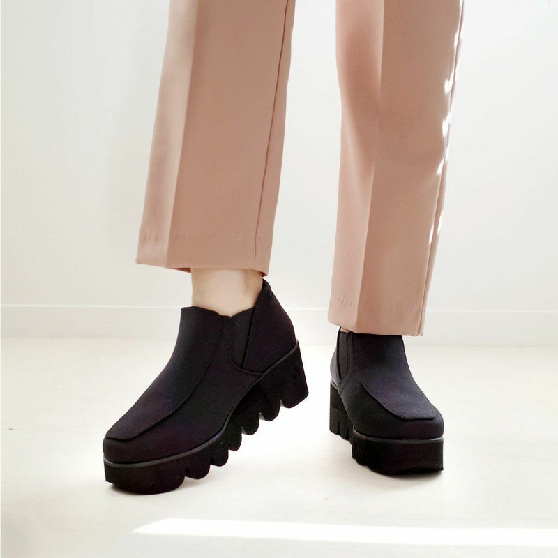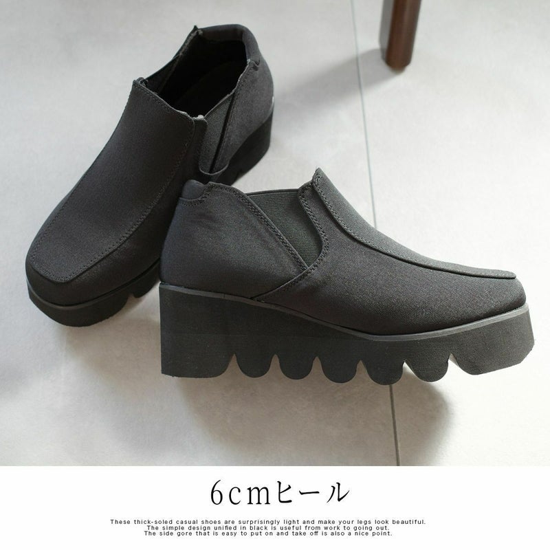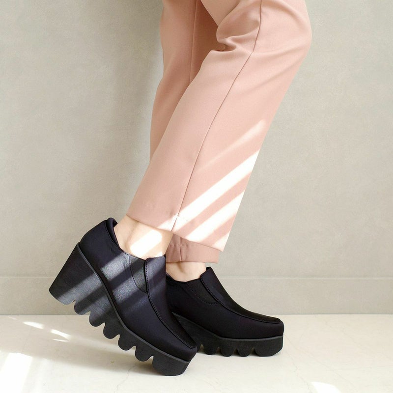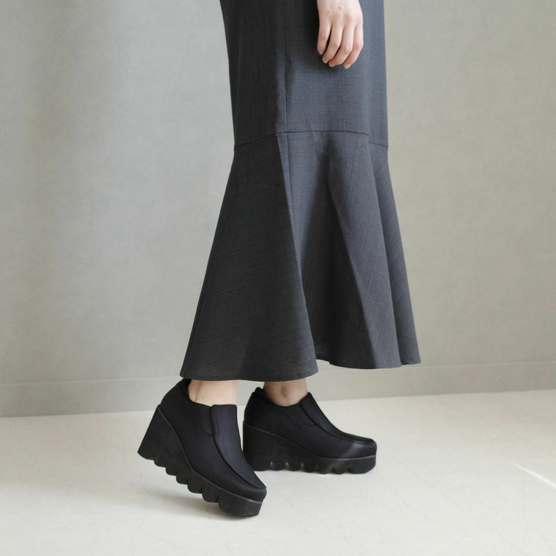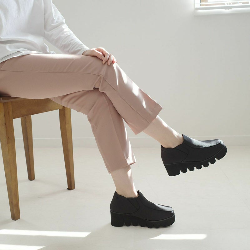 脱ぎ履きしやすいサイドゴアも嬉しいポイント。軽量ウエッジソールで歩きやすくフィット感が超快適な履き心地!