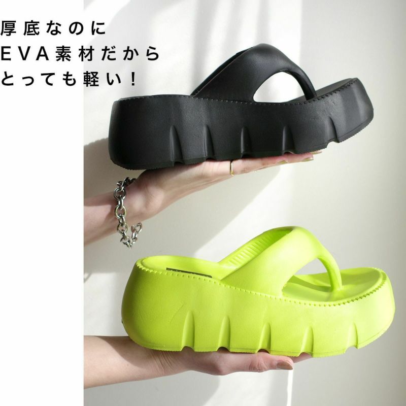 6.5cmの厚底なのにEVA素材だから軽量!さっと脱ぎ履きできて楽ちん!安定感があり心地よい弾力がくせになる履き心地です。