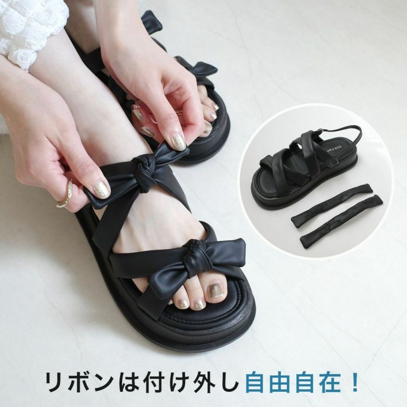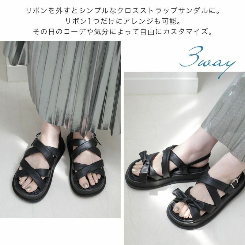 リボンを外せばシンプルなクロスストラップサンダルとして履けて、気分やコーデによってカスタマイズできるのも嬉しいポイント。
