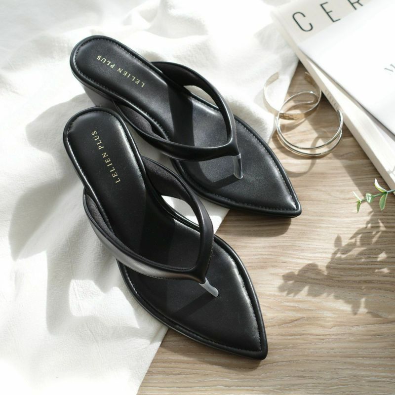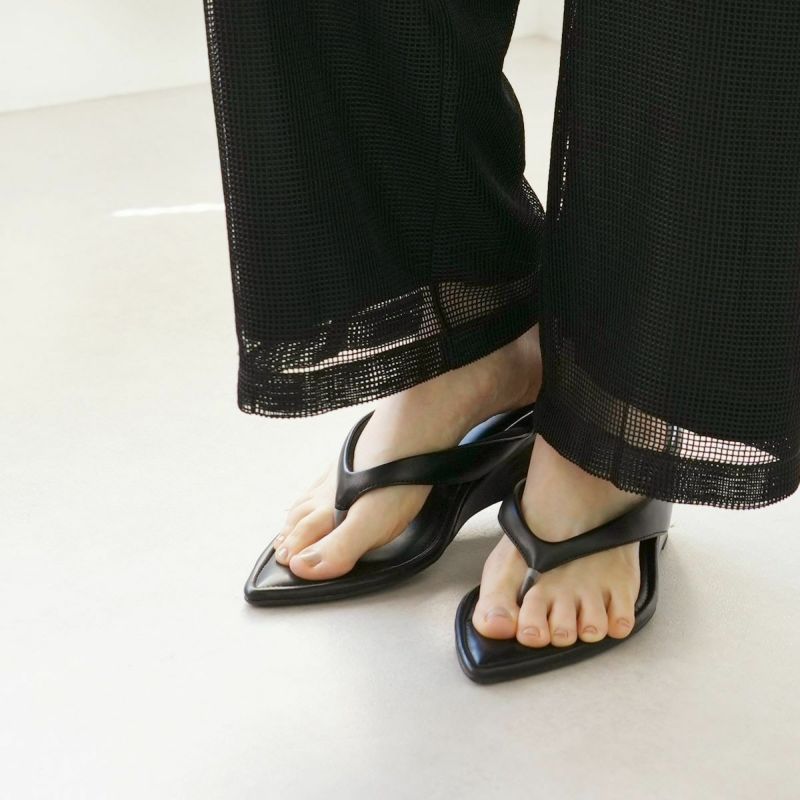 ポインテッドトゥ×6.5cmソールですらりとした足元が完成。ふっくらとしたクッション付きトングは