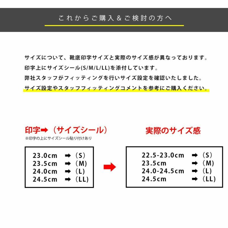 • サイズについて、靴底印字サイズと実際のサイズ感が異なっております。印字上にサイズシール(S/M/L/LL)を添付しています。 弊社スタッフがフィッティングを行いサイズ設定を確認いたしました。 サイズ設定やスタッフフィッティングコメントを参考にご購入ください。