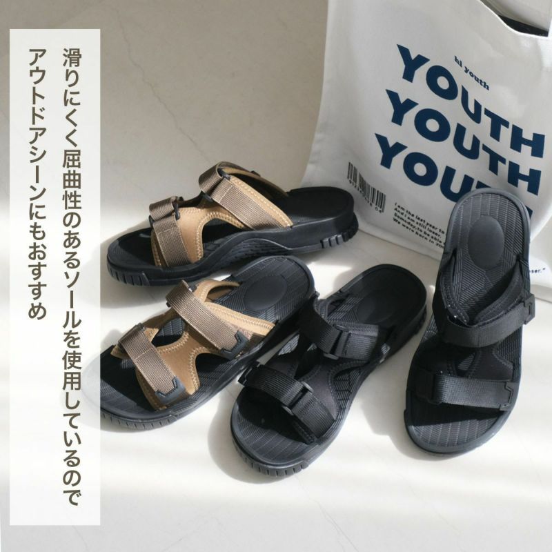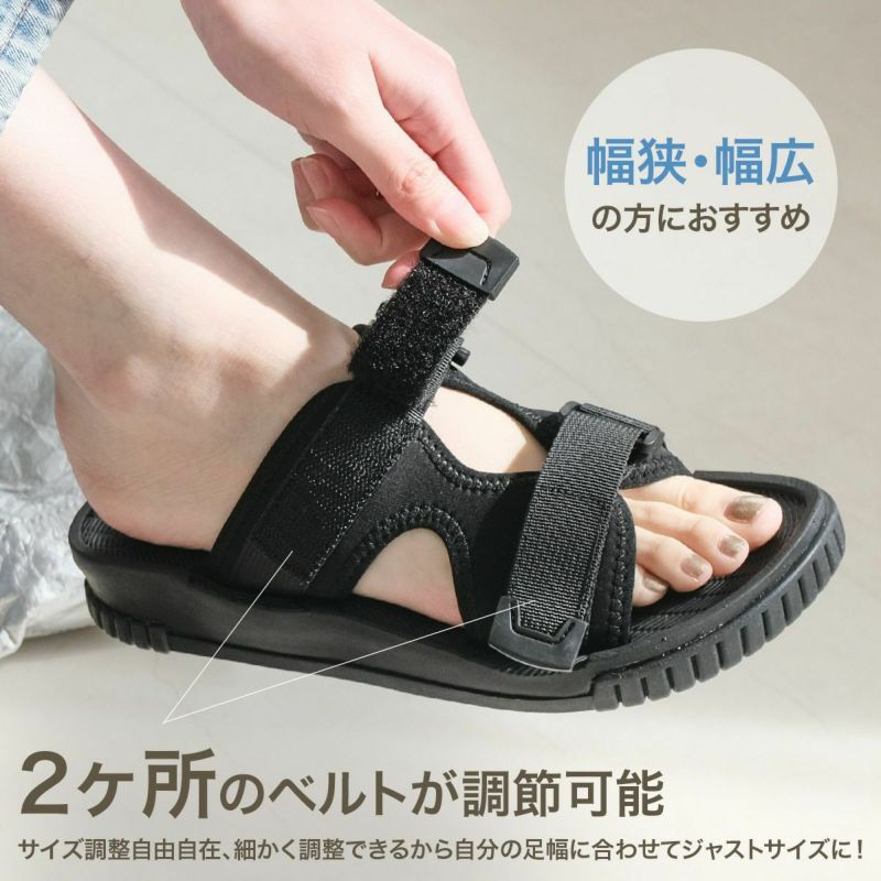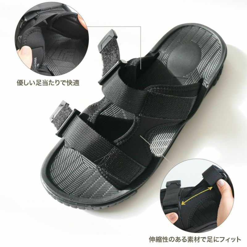 滑りにくく屈曲性のあるソールを使用しているので、アウトドアシーンにもおススメ!アッパーをサイズ調整可能にすることで、かかとストラップの無いサンダルでも