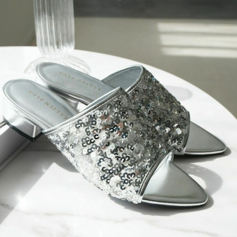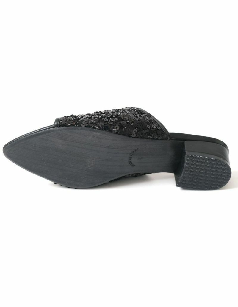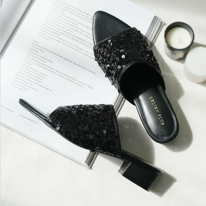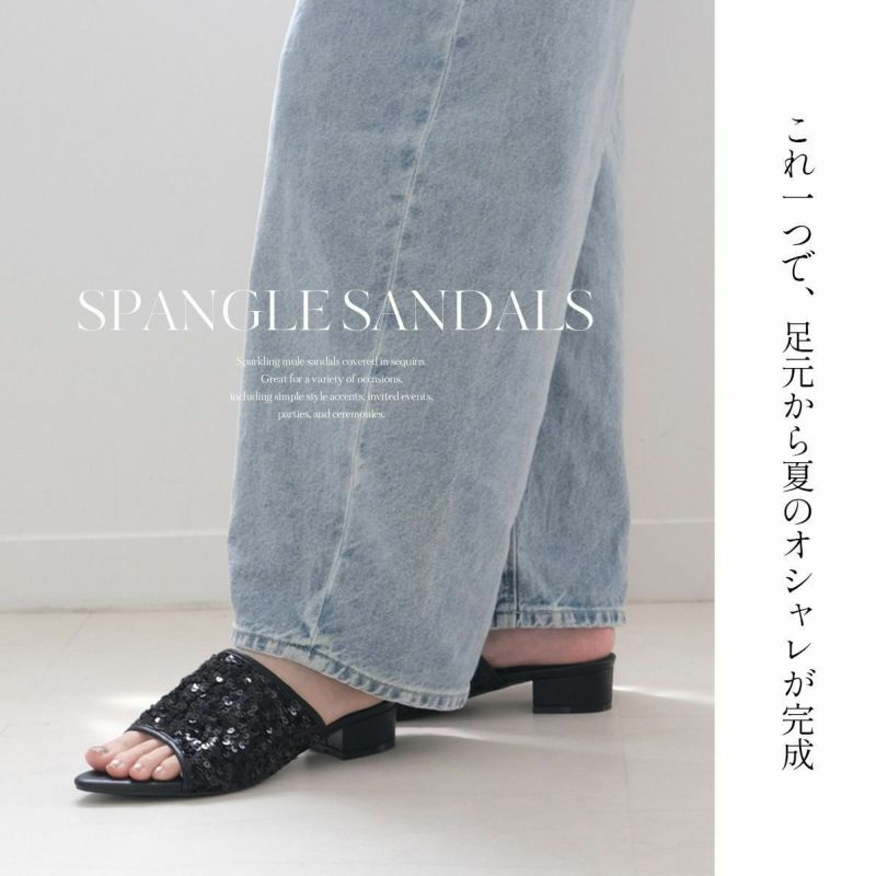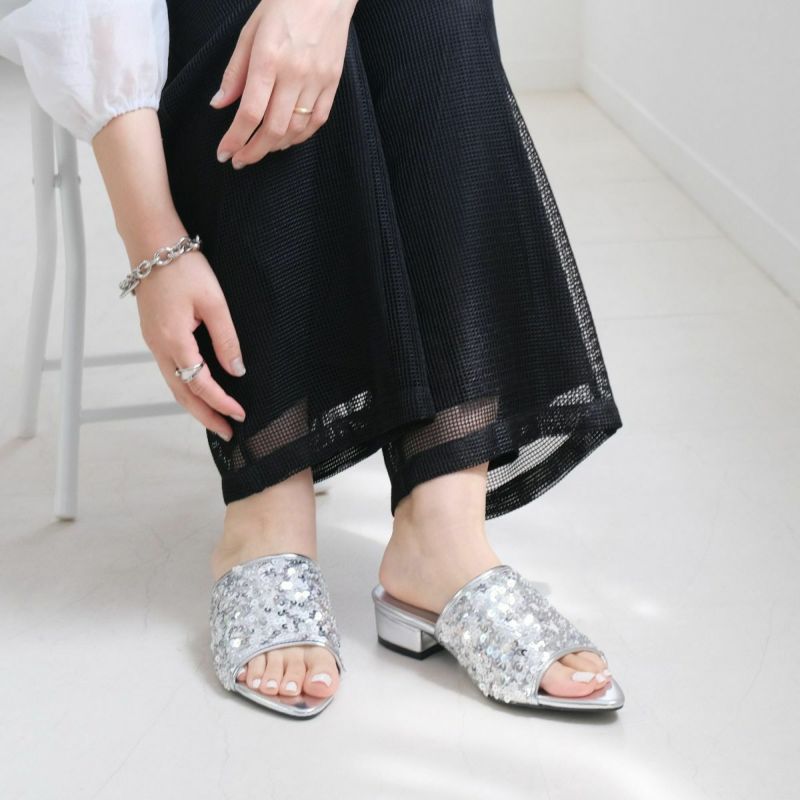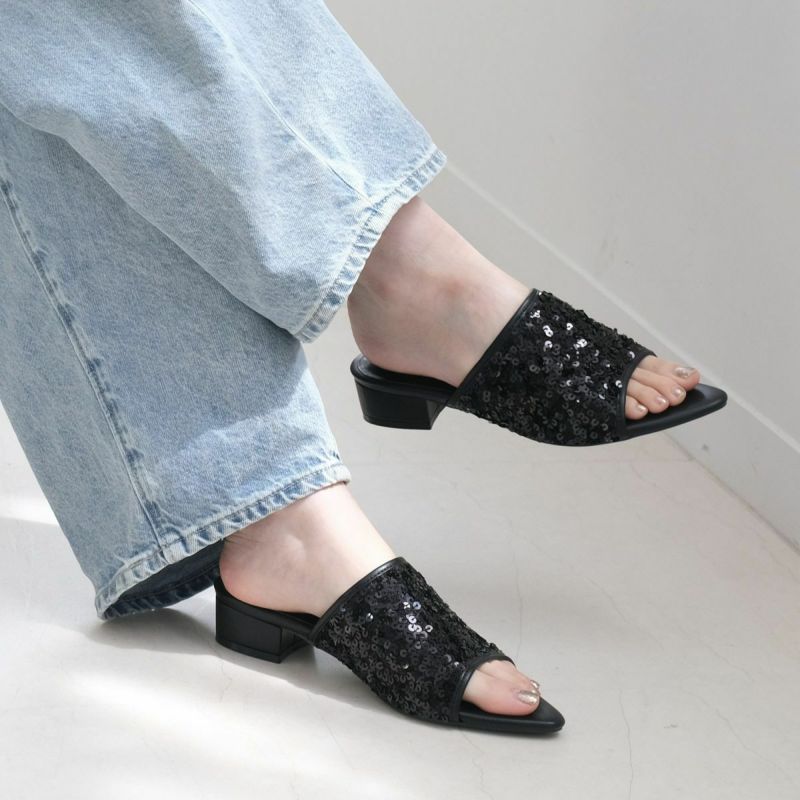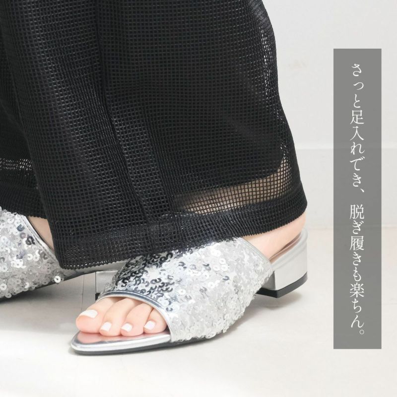 スパンコールを敷き詰めたキラキラと輝くミュールサンダル
