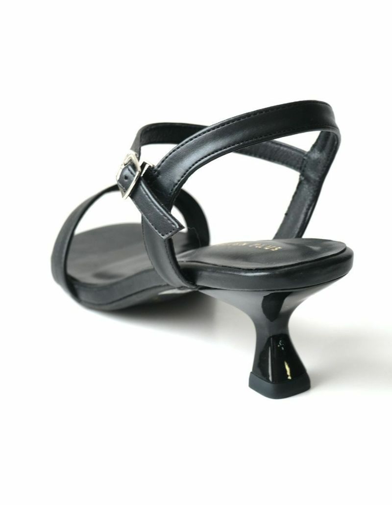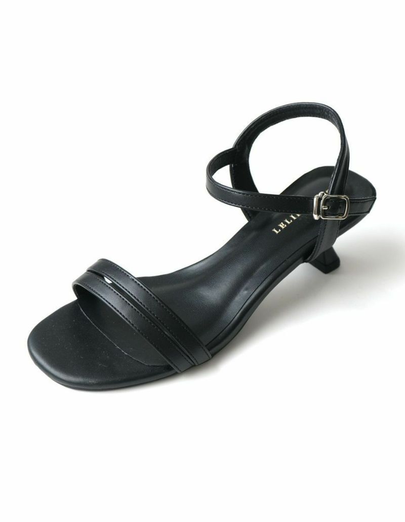くびれたデザインの変形ヒールで洗練された大人の足元にストラップはフック式で、着脱もスムーズに。