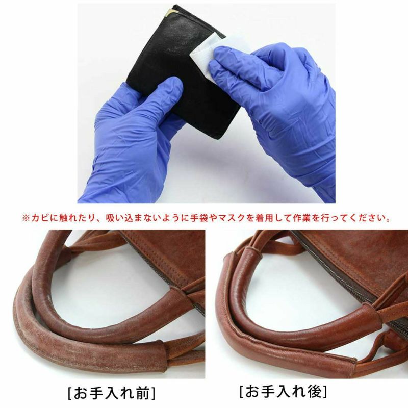 皮革製品に付着した菌や汚れを除去し、カビの生育を抑制する