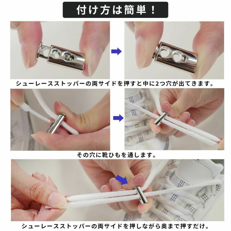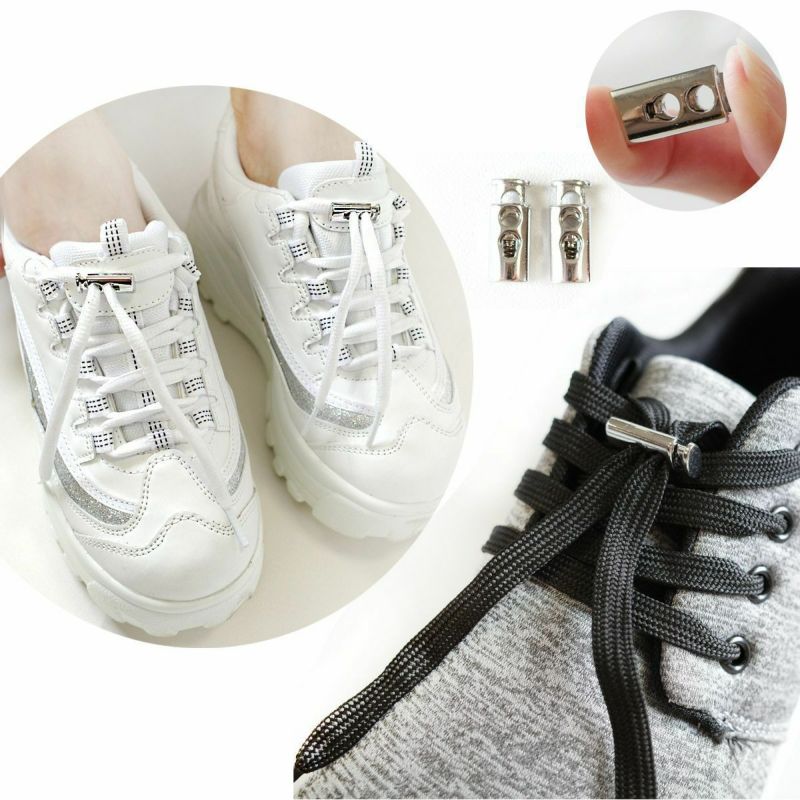 簡単!紐をストッパーに通すだけ!二つ穴タイプシューレースストッパーを靴ひもにつけるとスニーカーの脱ぎ履きが楽に!