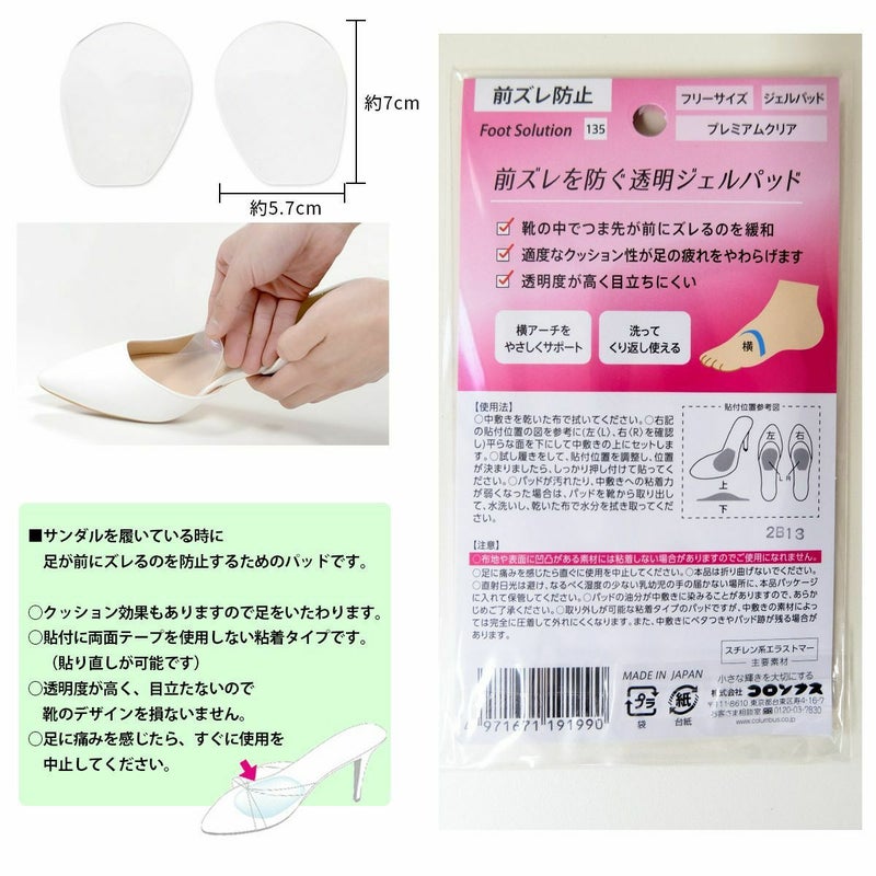 フットソリューション プレミアムクリアコロンブス☆つま先前ズレ予防透明ジェルパッド 中敷き