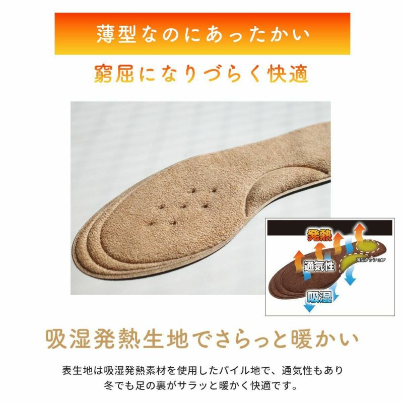薄型なので窮屈になりづらく、土踏まずとかかとに内蔵されたクッションで足への負担を軽減してくれます。ニオイ吸着性に優れた活性炭シートも挟み込んでおり、靴中の気になるニオイも安心!