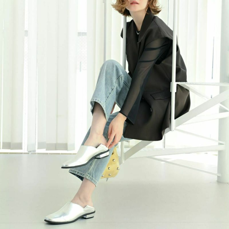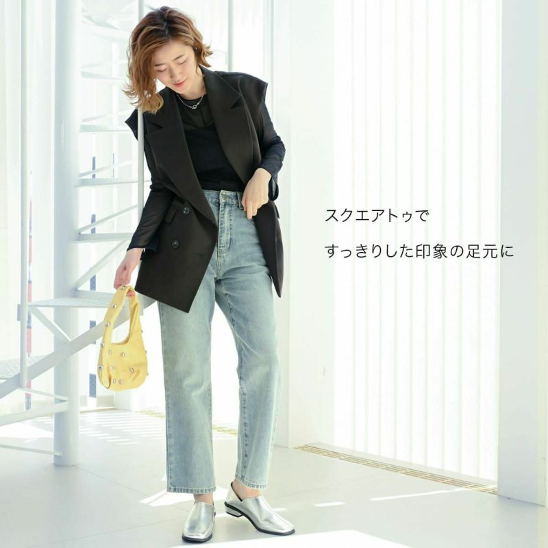 スクエアトゥですっきりした印象の足元が叶うスライドシューズ