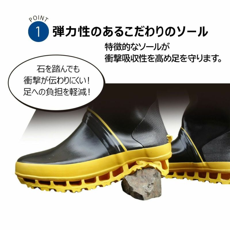 衝撃吸収性を高めるソールで足を守ります。老舗ゴム履物メーカーの福山ゴム工業の製品です。「エアボスタイヤ」から誕生した丈夫なワークブーツ。