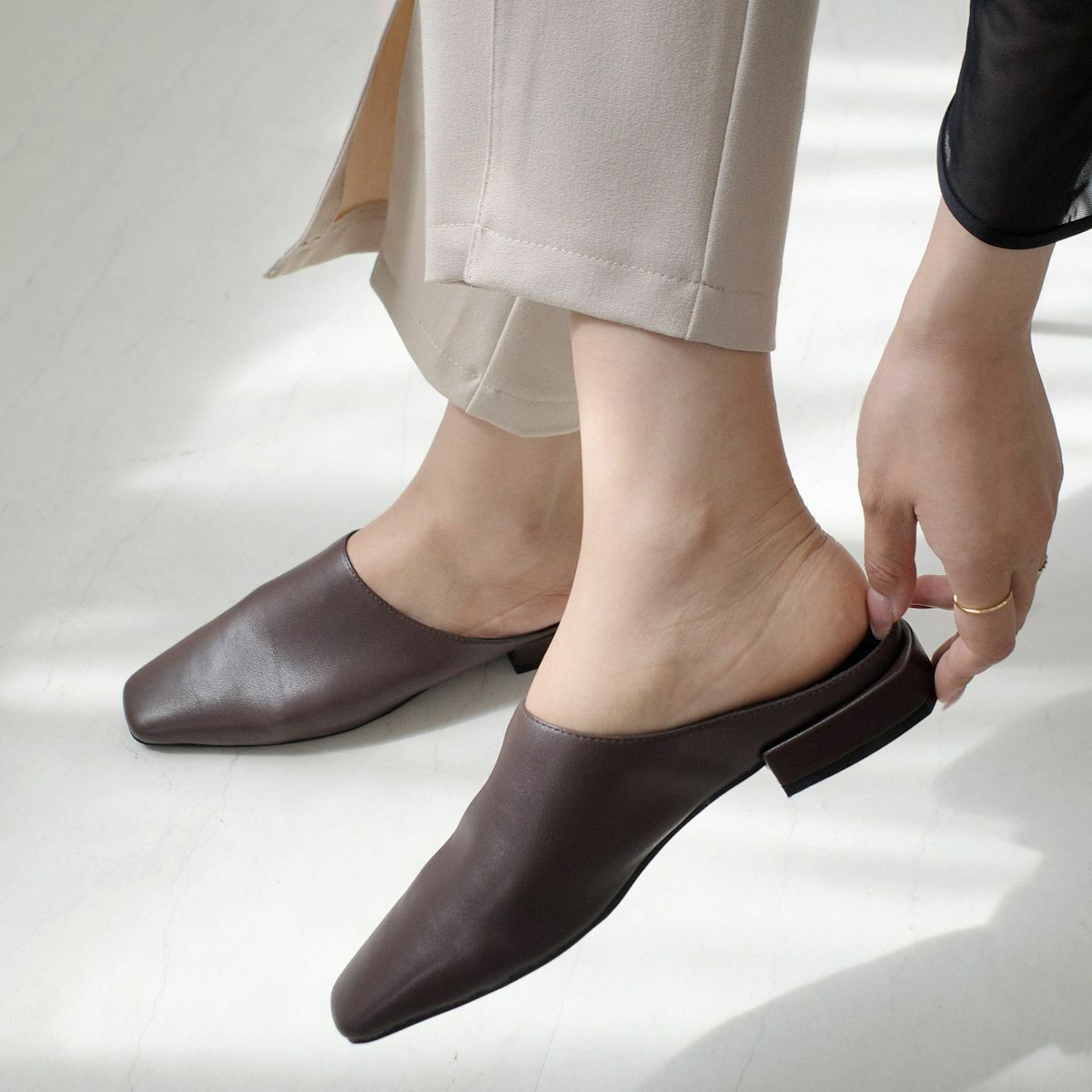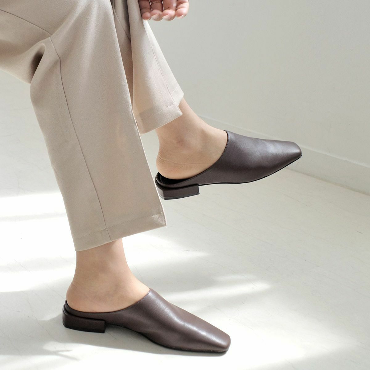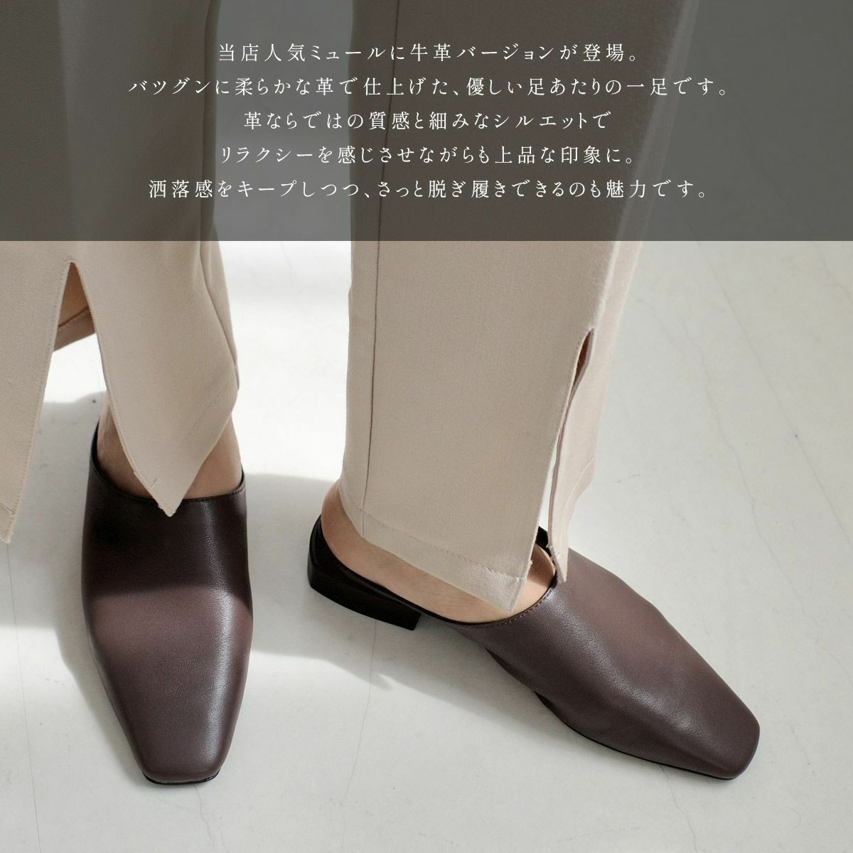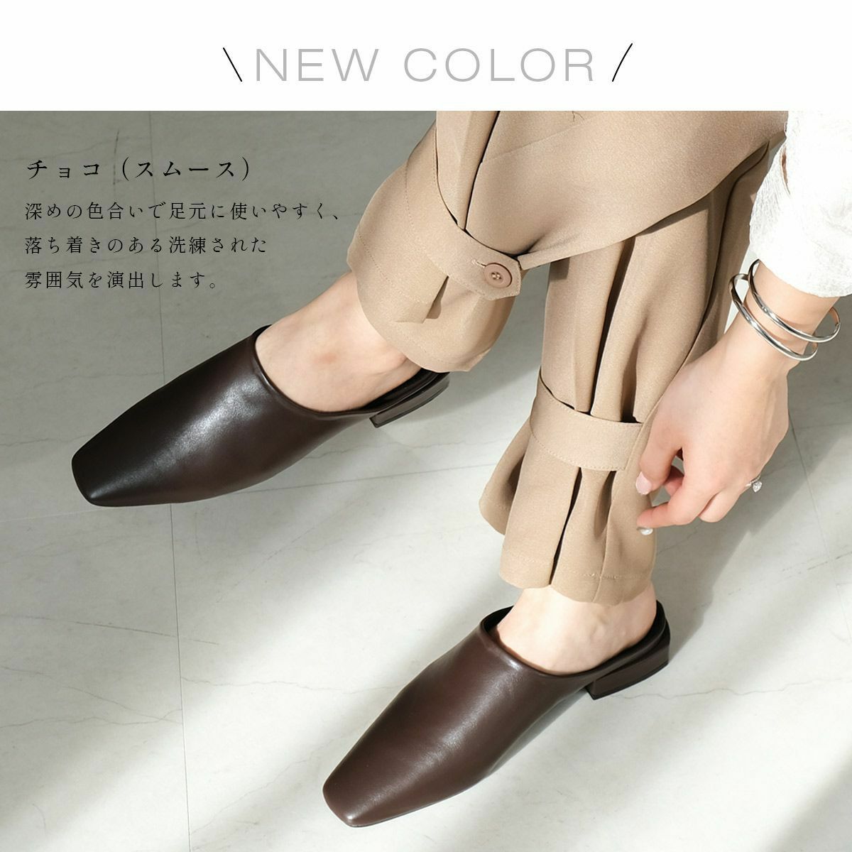 ミュールは足首が露出されることから、脚長効果も期待できます。足を細く見せたい方にもおすすめです。