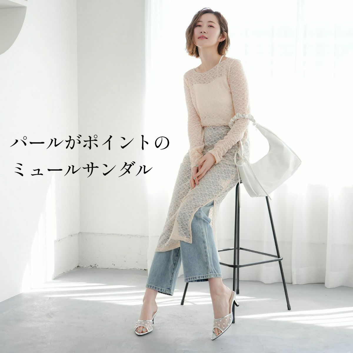 「ミュール」とはかかとのないサンダルのことで、オープンな抜け感で楽な履き心地が特徴。シンプルなデザインからフェミニンなものまで幅広いバリエーションがあり、夏のファッションに欠かせないアイテムとなっています。足首が露出されることから、脚長効果抜群!