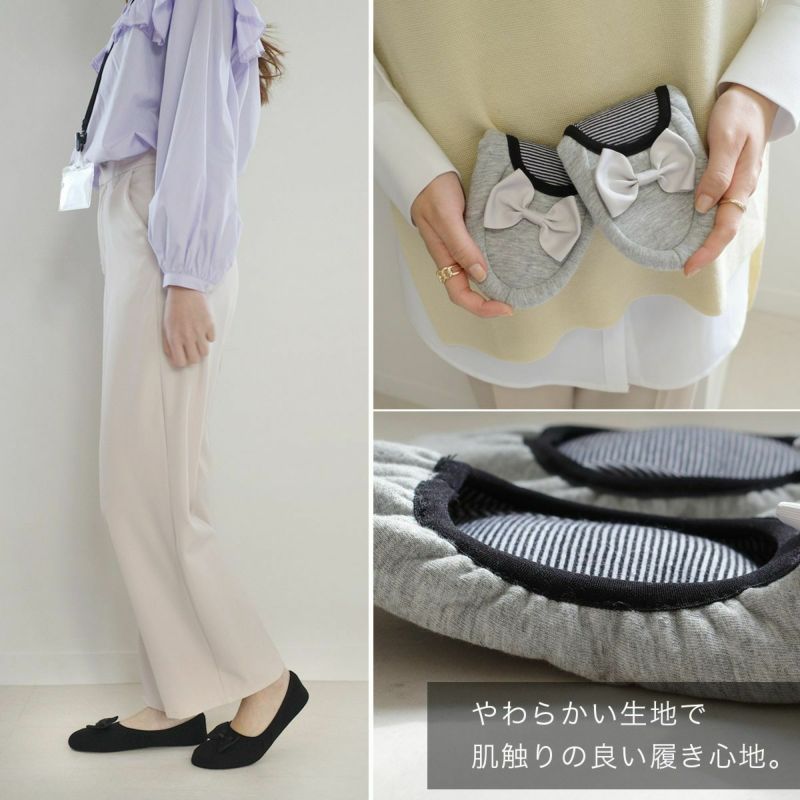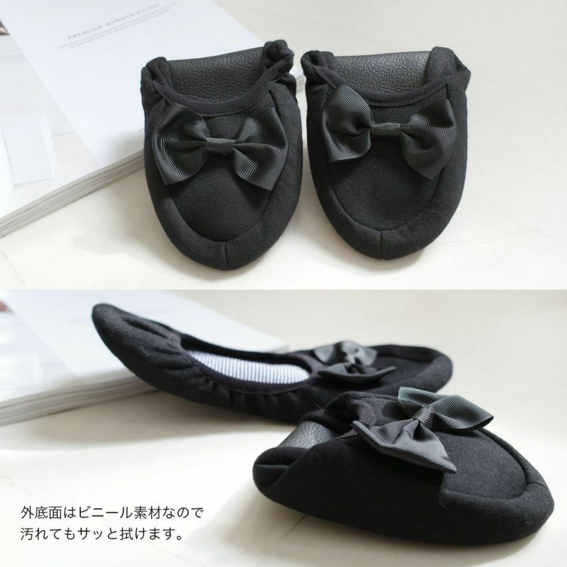 ■携帯に便利な、シューズタイプのレディース用折りたたみスリッパ/光沢感のあるリボンで上品な印象。生地が柔らかく優しい履き心地です。外底面はビニール素材なので汚れてもサッと拭けます。授業参観、入学卒業式などの学校行事や旅行、冠婚葬祭などで活躍する携帯シューズ。1足持っておくととっても便利。軽くて収納できるので荷物の多いシーンでも楽に履き替えることができます。