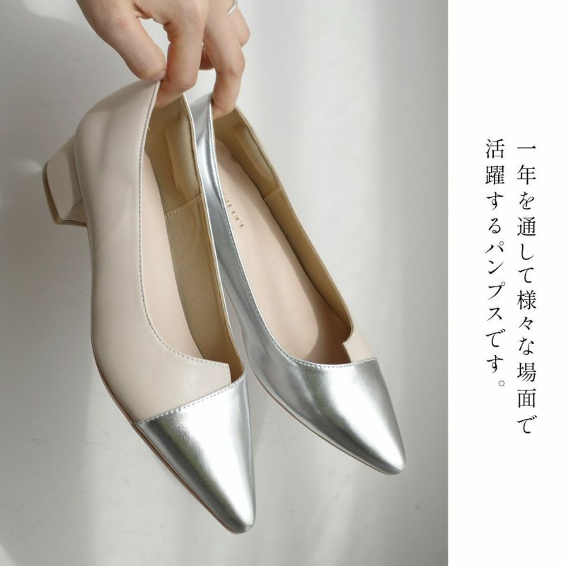 “低め太ヒールで歩きやすい”切替えデザインがポイントのパンプス