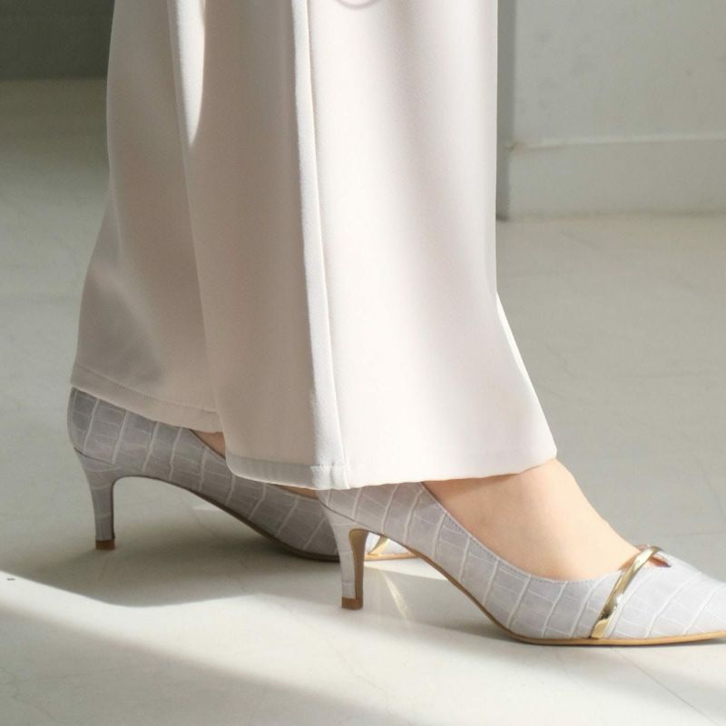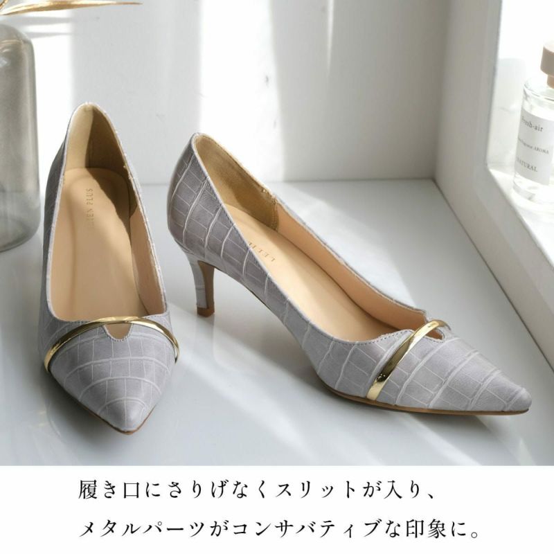 程よい高さのヒールで女らしい履き口にさりげなくスリットが入り、メタルパーツがコンサバティブな印象のパンプス