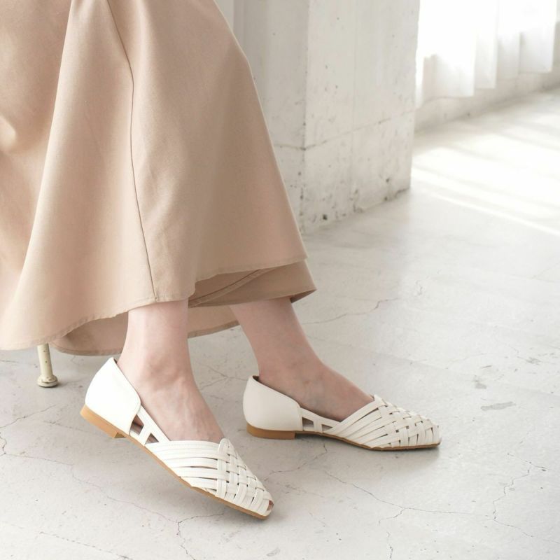 涼し気なクロス編みが、コーデにナチュラルな抜け感をプラスしてくれます。ローヒールなので歩きやすくリラックスムード満点。カジュアルになりすぎない細身シルエットとスクエアトゥ。