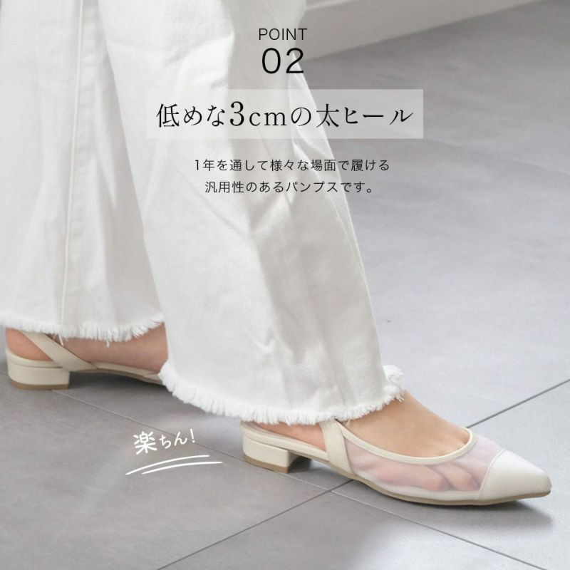 ローヒールなので歩きやすい。カジュアルにもフェミニンにも使える、かかとストラップのミュールパンプス。
