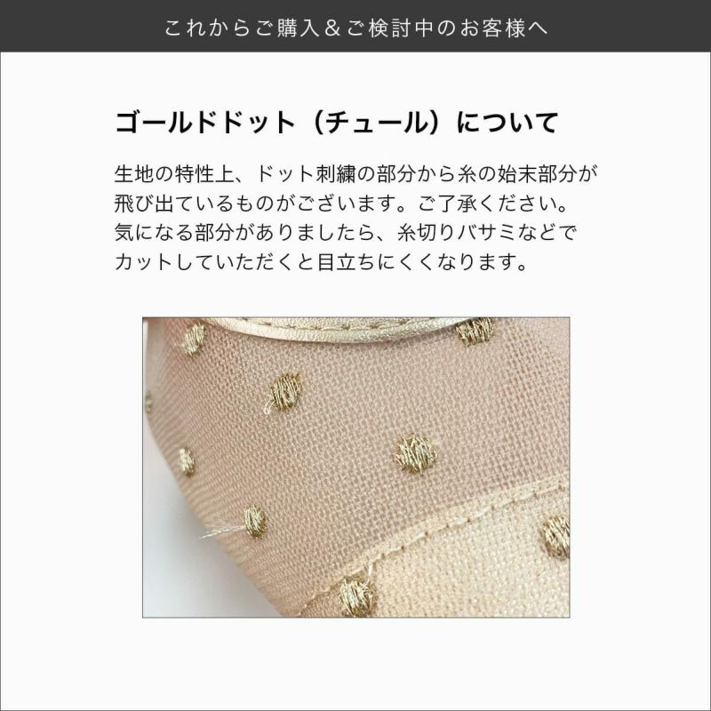 • ゴールドドットチュールは生地の特性上、ドット刺繍の部分から糸の始末が飛び出ているものがございます。気になる部分がありましたら糸切りバサミなどでカットしていただくと目立ちにくくなります。