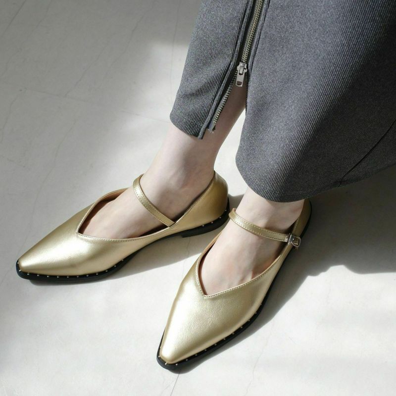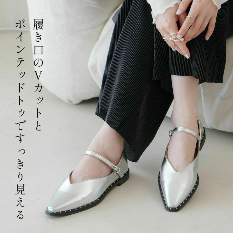 履き口のVカットとポインテッドトゥで足元をすっきり華奢に見せてくれます。ストラップ付きで歩くときもパカパカしにくいうえ、低めのヒールは疲れにくくたくさん歩く日にも活躍します。