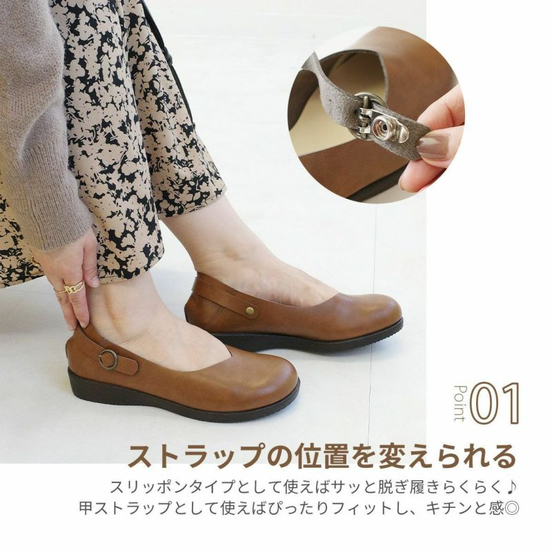 ”甲ストラップの位置を変えて” ”かかとを踏んで”シーンに合わせて使い分け!スリッポンタイプとして使えばサッと脱ぎ履きラクラク。