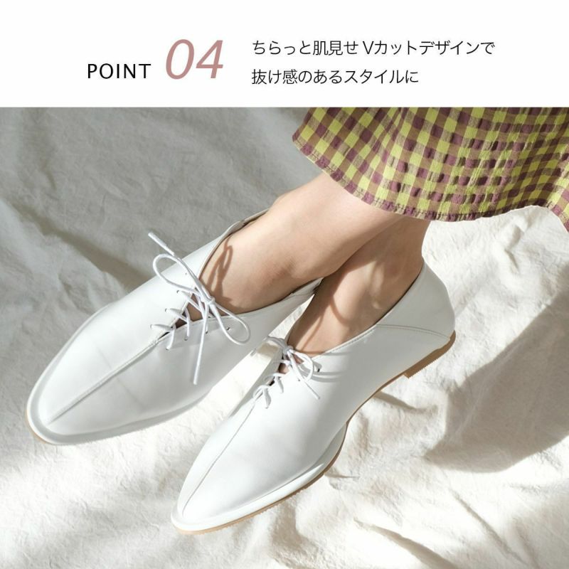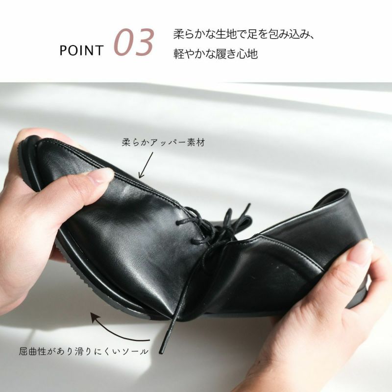 ポインテッドトゥと甲部分のVカットでローヒールながらスッキリとした印象に。屈曲性があり滑りにくく、フラットなので歩きやすくなっています。