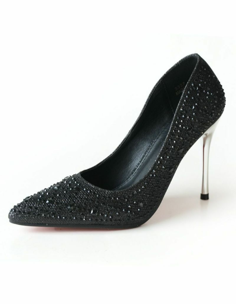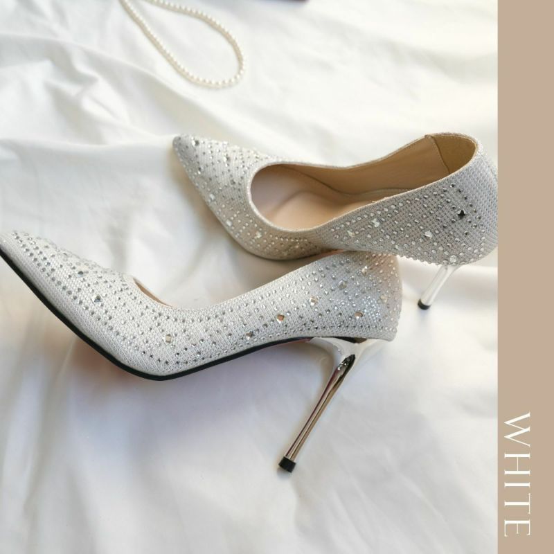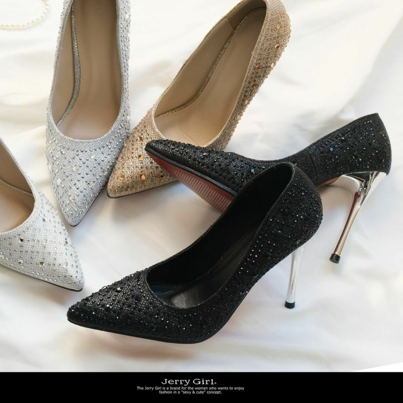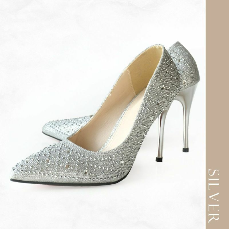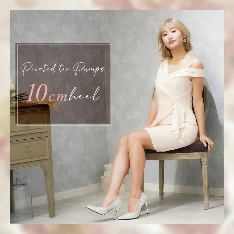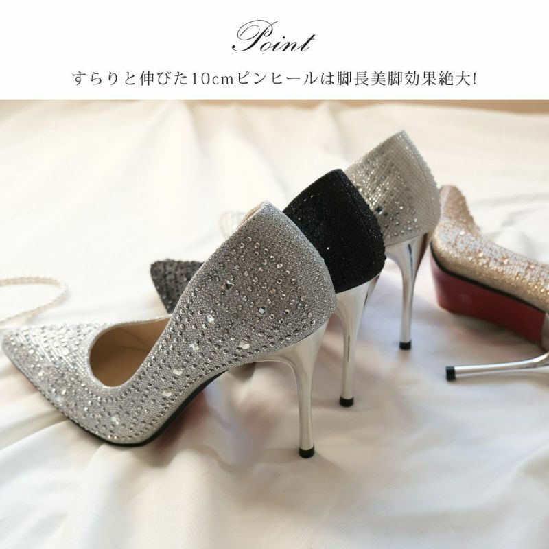 美脚度の高い10cmヒールで女性らしいシルエットラメ素材とラインストーンがラグジュアリーな輝きを放ってくれます。