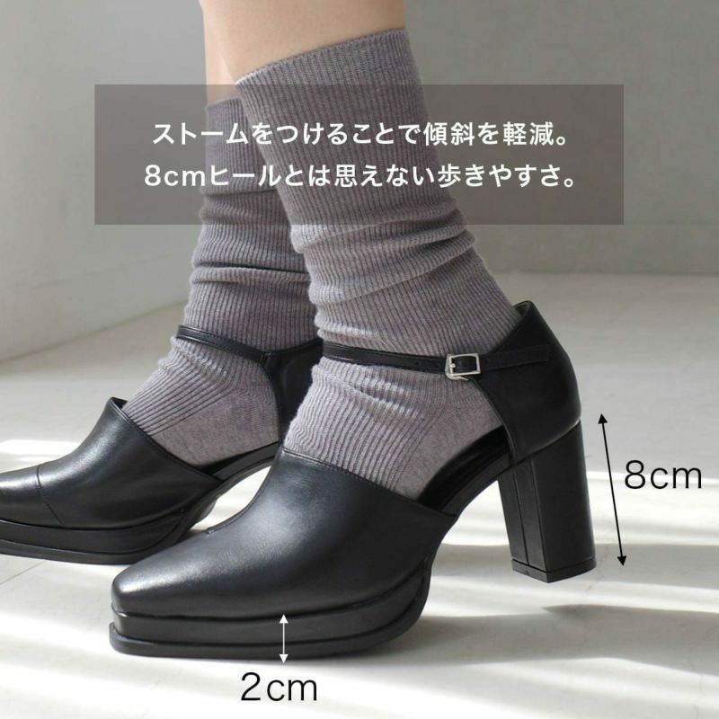 ストームをつけることで傾斜を軽減。8cmヒールとは思えない歩きやすさを実現しました。ストラップがあることによって脱げにくく、セパレートデザインが足元に適度な抜けを作り出してくれます。