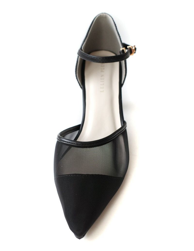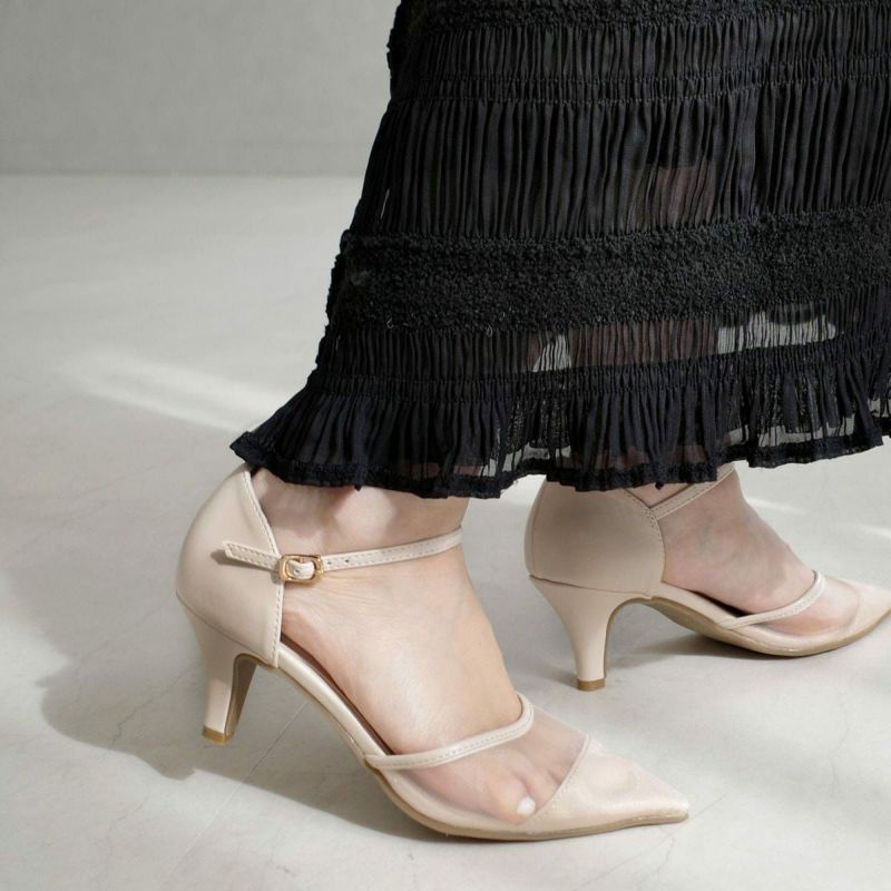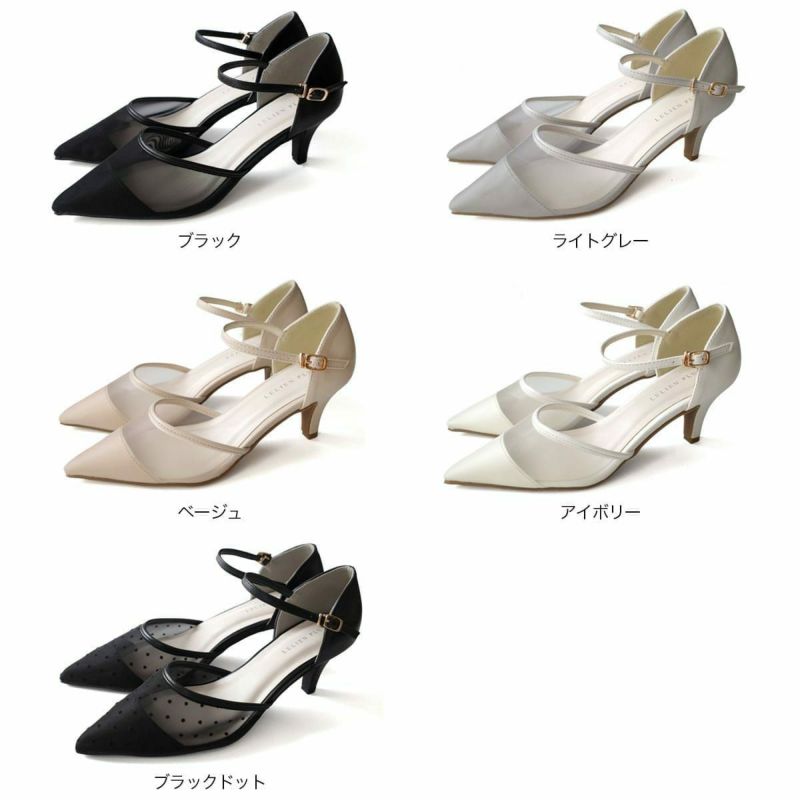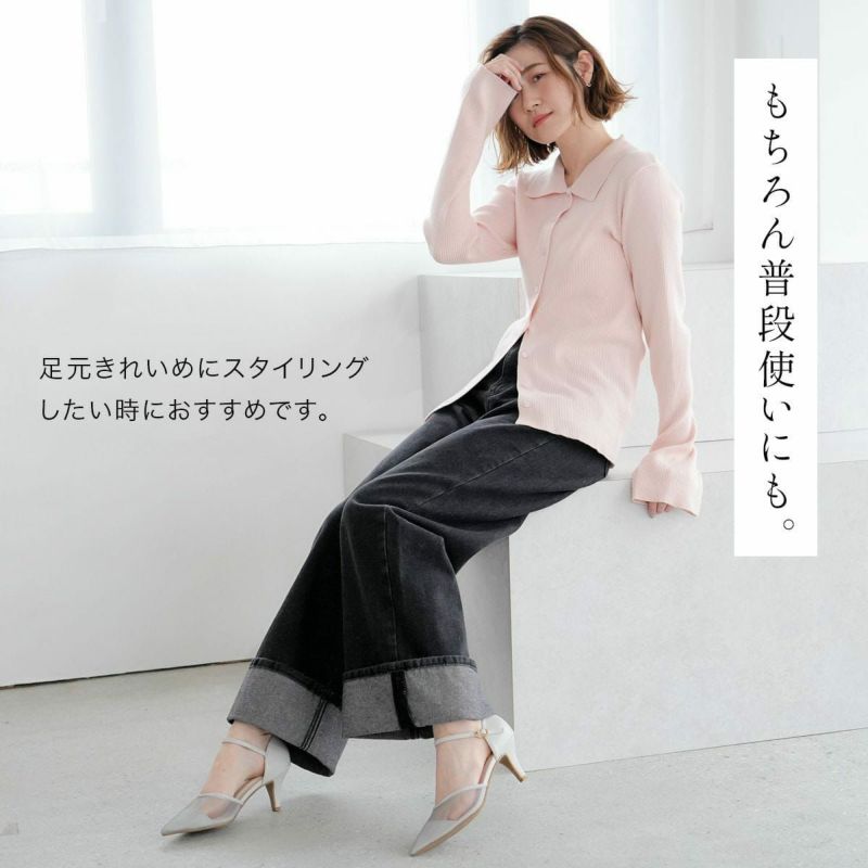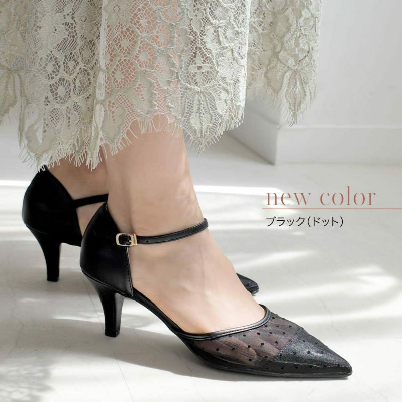 つま先・かかとが隠れた6.5cmの細いヒールで、チュールの透け感がエレガントな足元を演出します。結婚式や披露宴にお呼ばれした時の靴のマナーをきちんとクリアしたデザインなので、安心して履いていただけます。