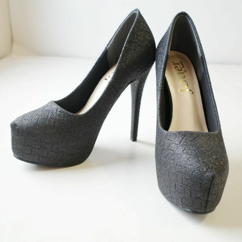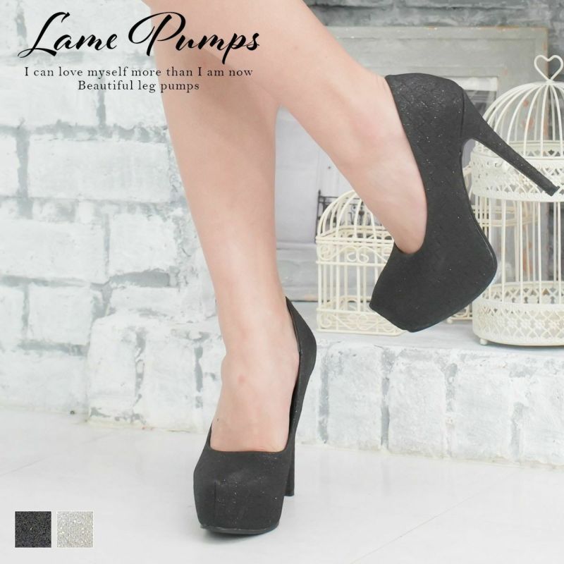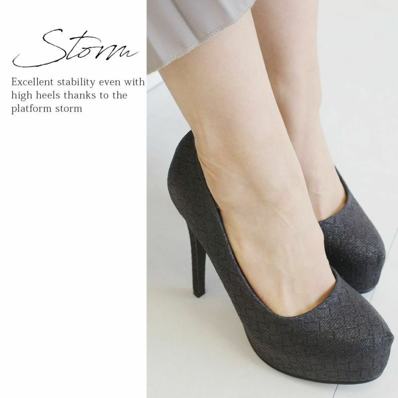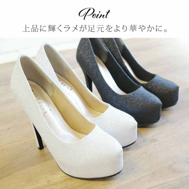 格子ラインが入ったラメ素材13.5cmヒールと厚底ストームなのに歩きやすい。低反発クッションインソールは履き心地◎。