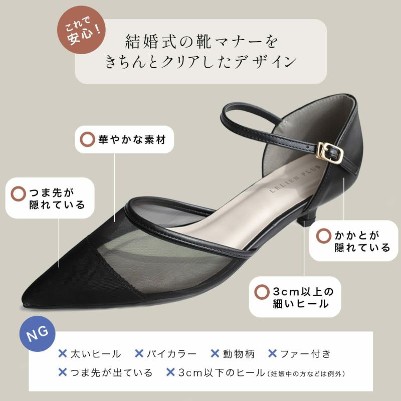 つま先はしっかりカバーしつつ、透け感のあるチュール素材が足元にエレガントな抜け感を演出します。低めヒールにありがちな安定感重視のブロックヒールではなく、結婚式やパーティー、披露宴など