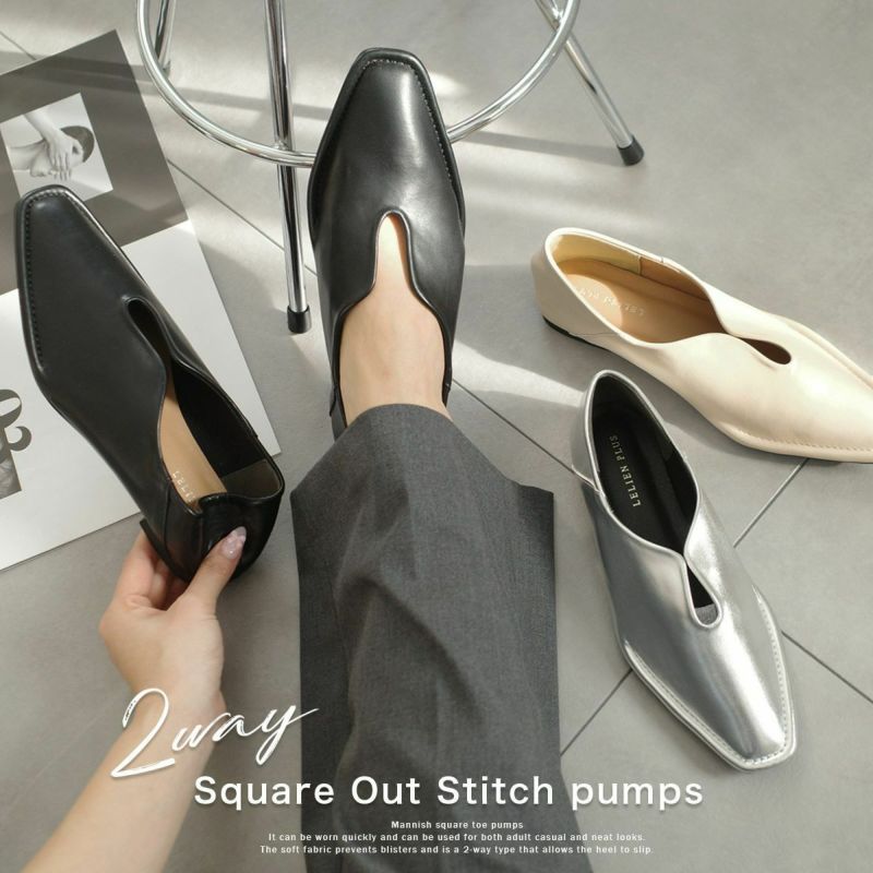 スクエアトゥのアウトステッチが、おしゃれなアクセントに!