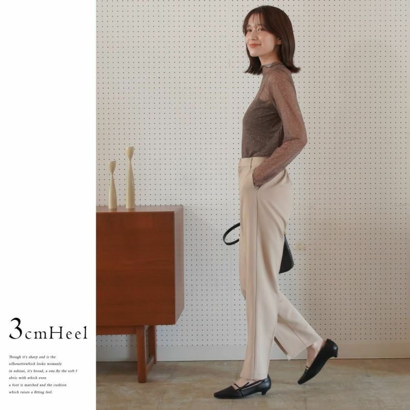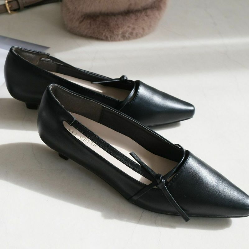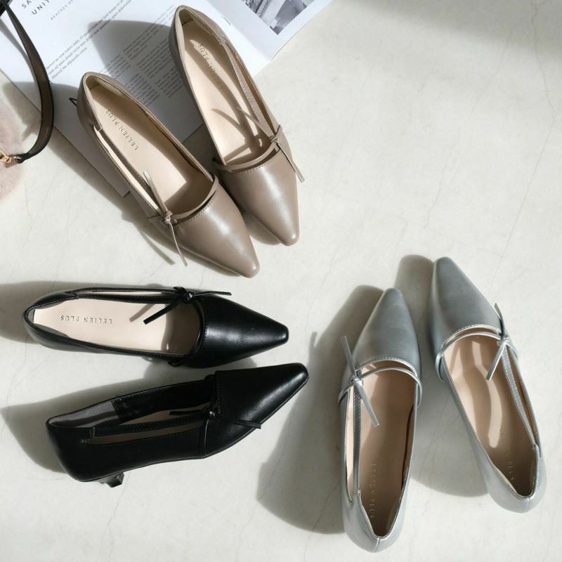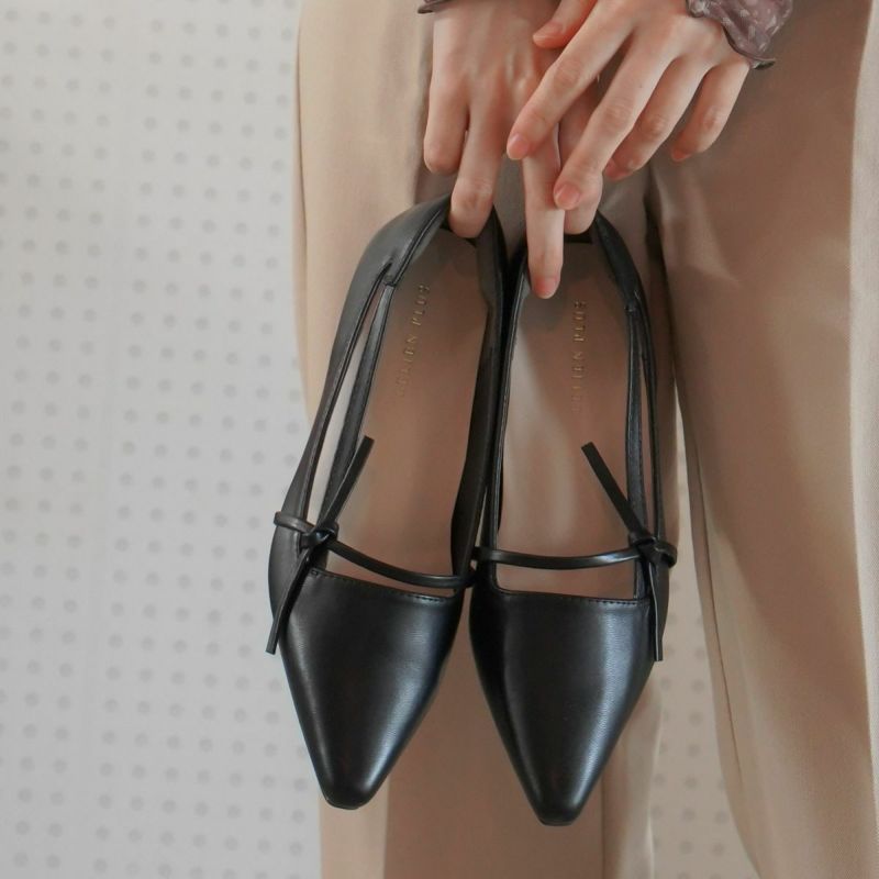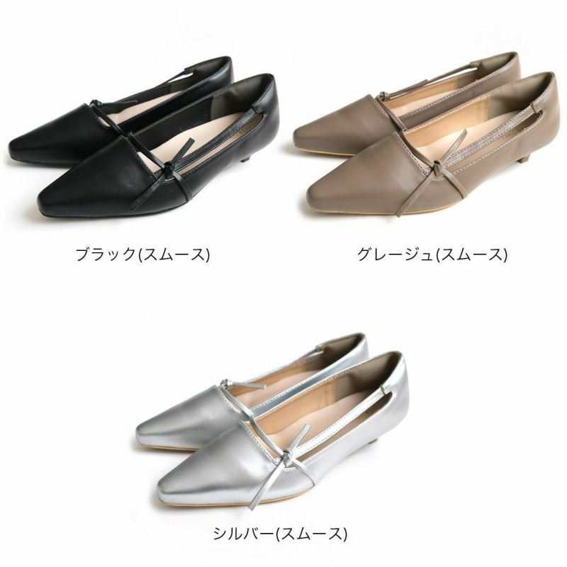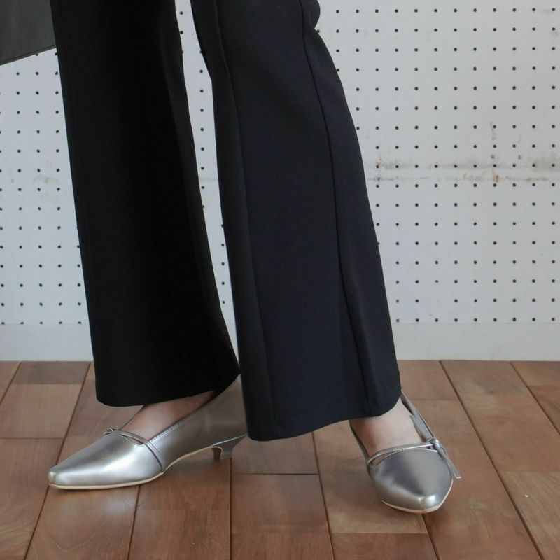低めのヒールで歩きやすく疲れにくい。一見シンプルな見た目ながらも、さりげないサイドのリボンがポイントに。