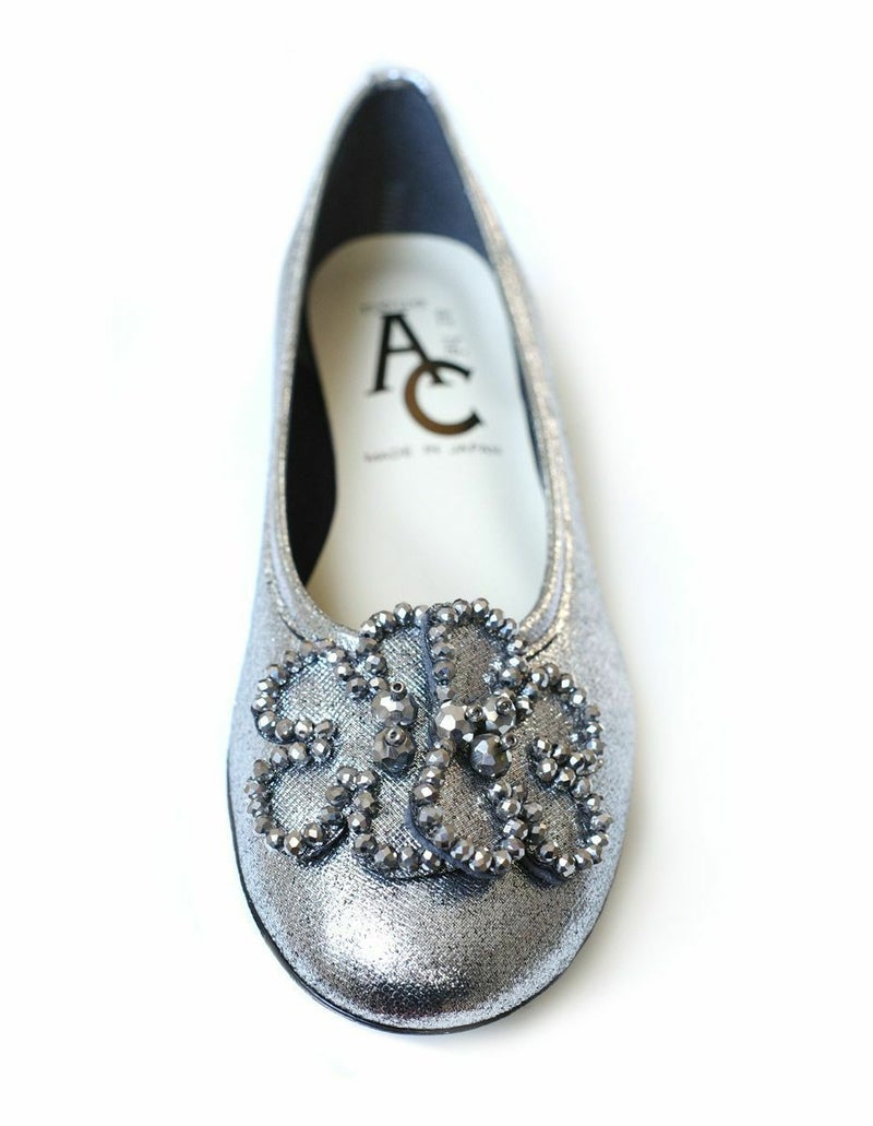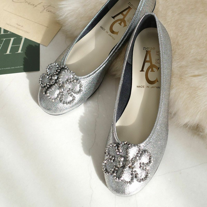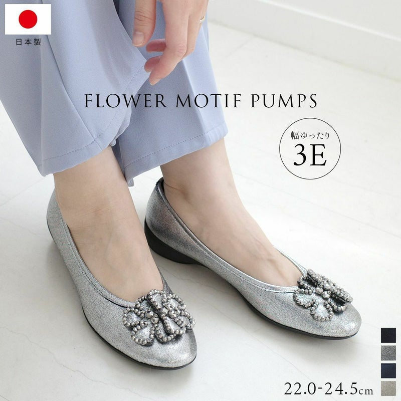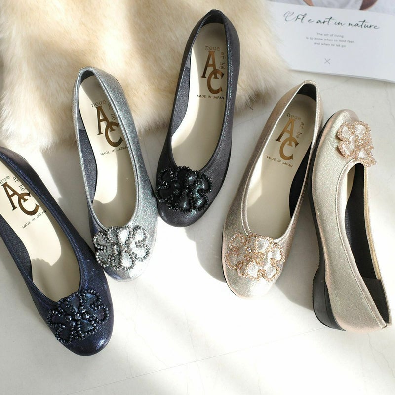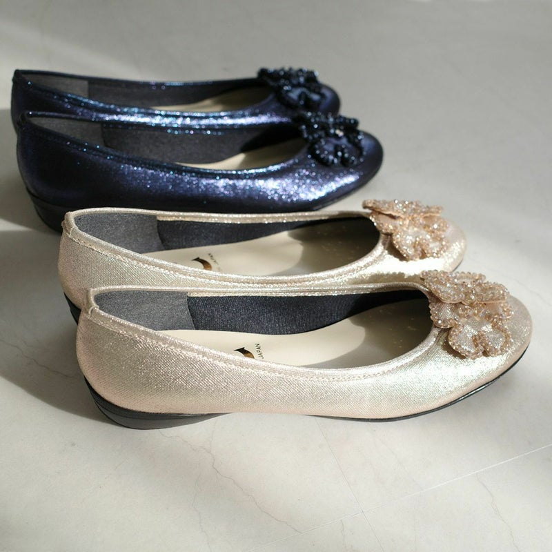 光沢のある生地と華やかなフラワーモチーフで、結婚式や卒入学式にもぴったりな一足。