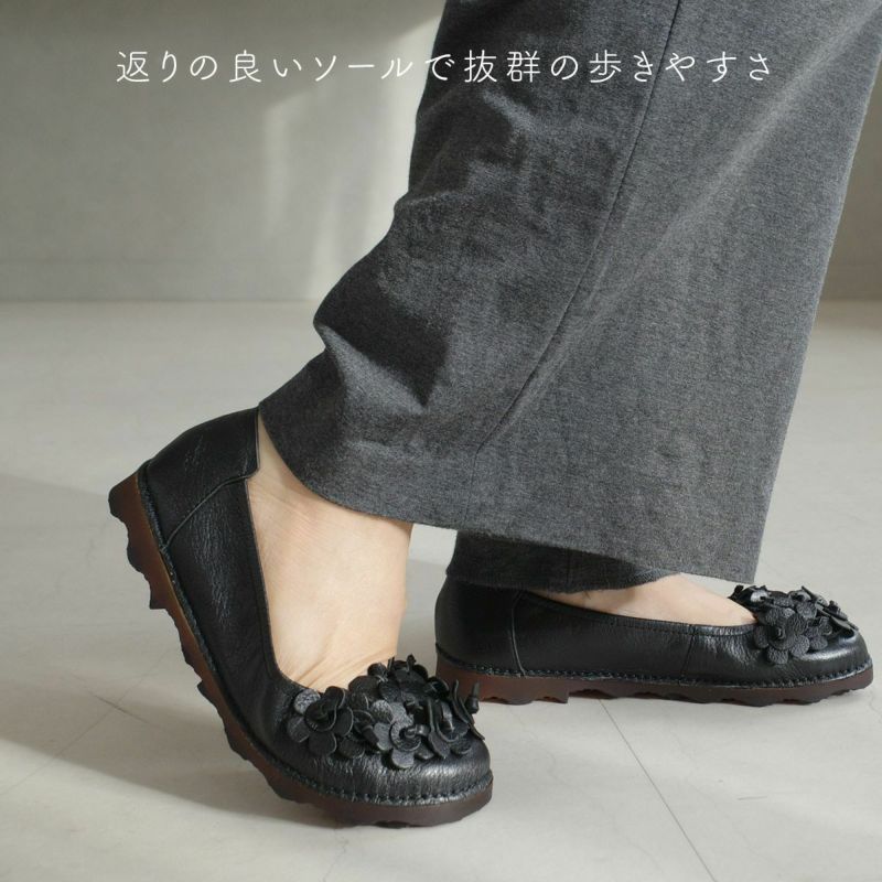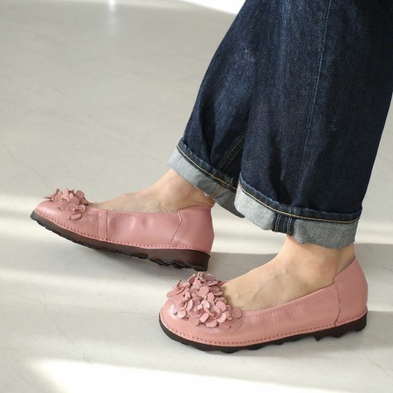 温もりを感じさせるフラワーモチーフが目を惹くフラットパンプス