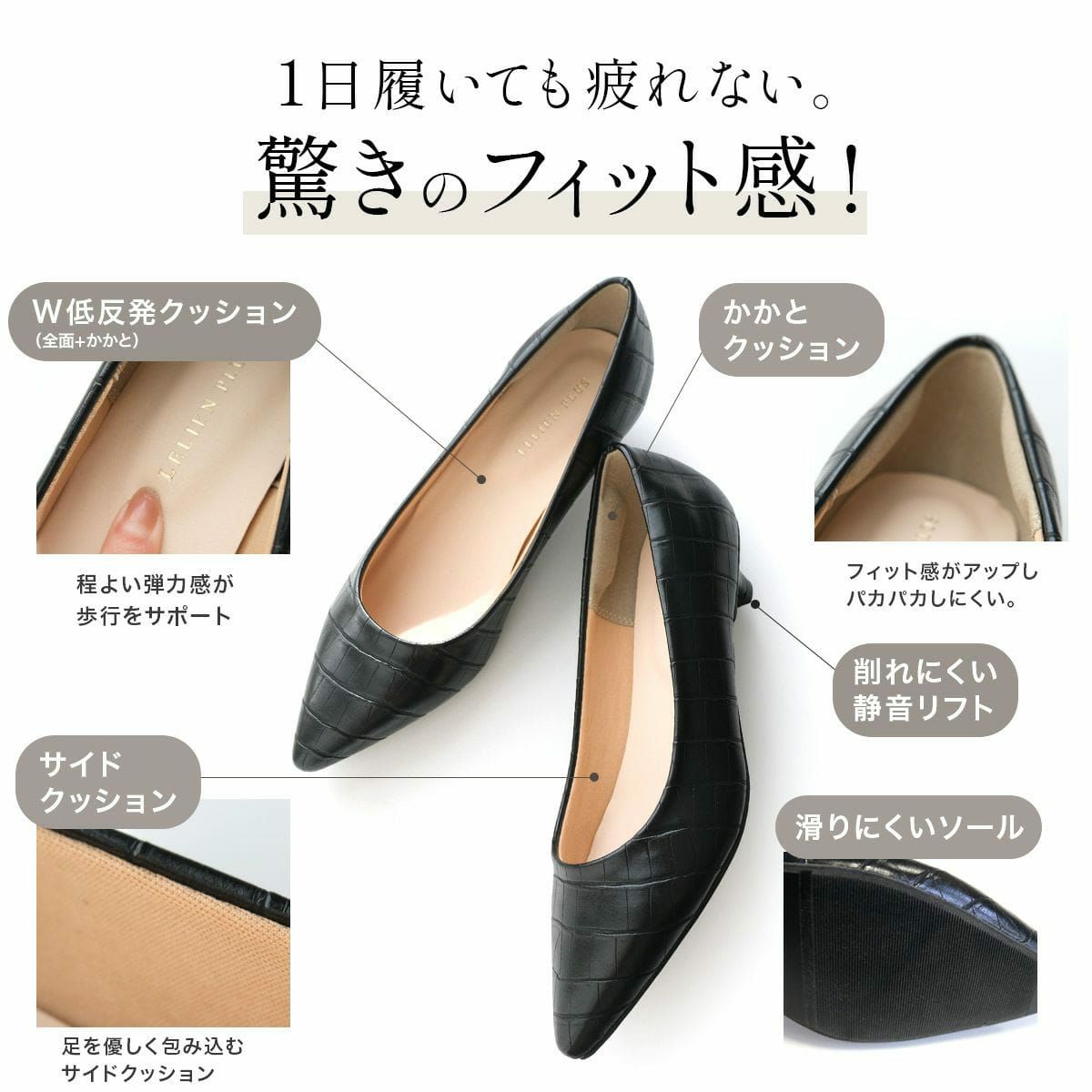 カツカツ音が気にならないゴム素材の静音リフトを採用。削れにくく、外回りのお仕事やお出かけシーンでも活躍します。