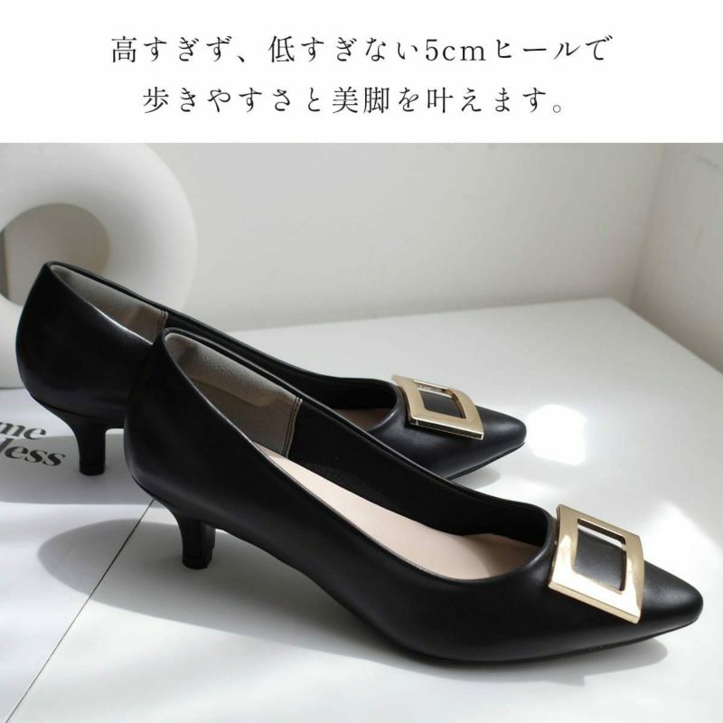 バックルモチーフを組み合わせ、ワントーンの配色で統一しモードな印象に仕上げました。高すぎず、低すぎない5cmヒールで歩きやすさと美脚を叶えてくれます。