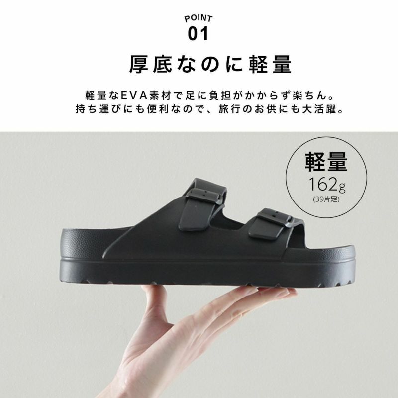 サッと履けて使いやすい、ダブルベルトサンダル。土踏まずのアーチがしっかりフィットして快適な履き心地。