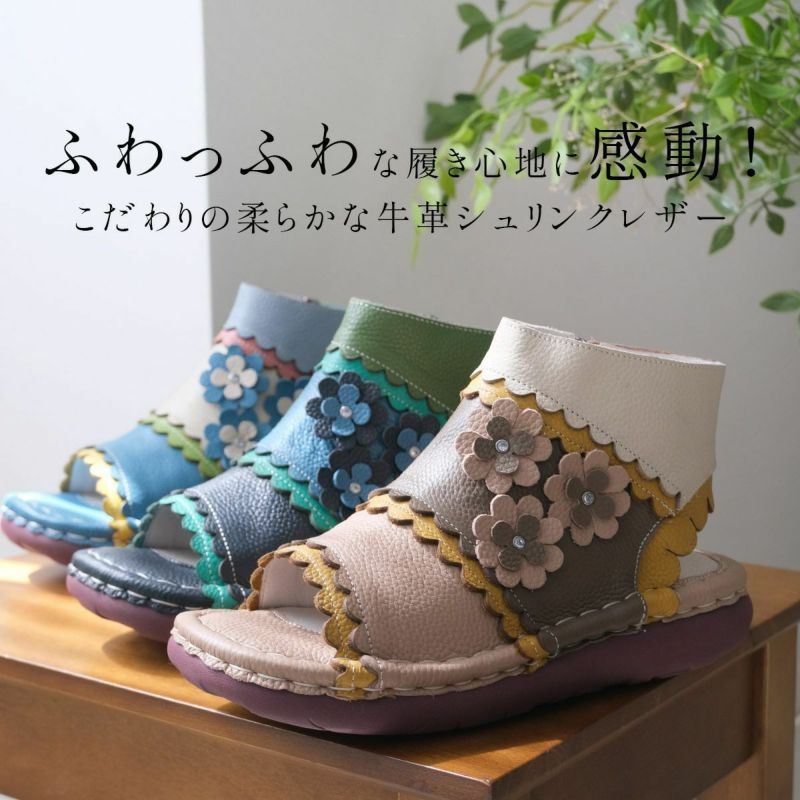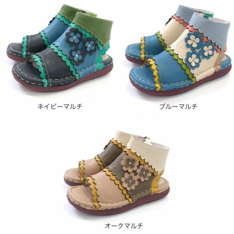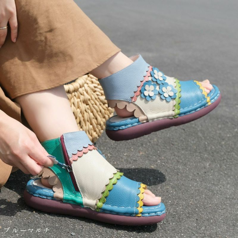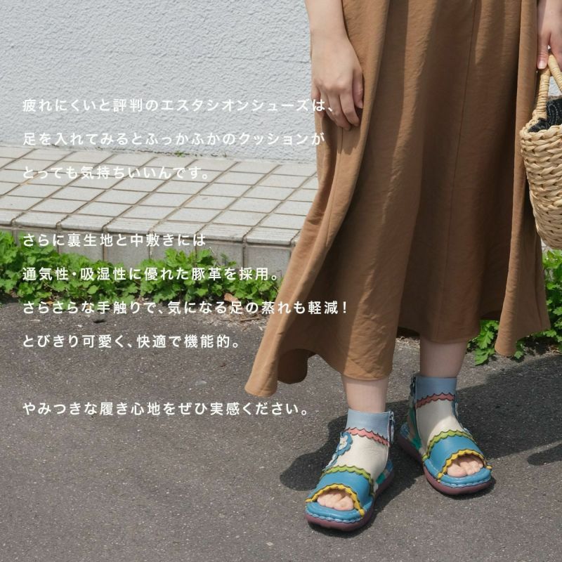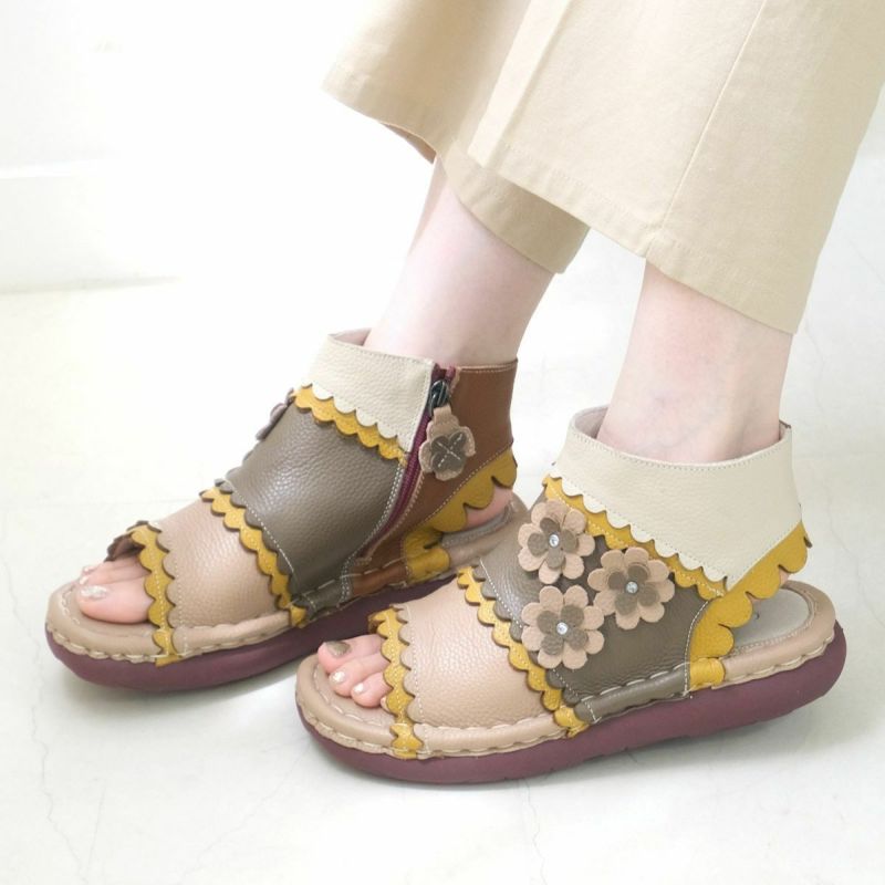 【在庫限り!特別価格!】サンダルブーツサンダル牛革コンフォートサイドファスナーフラワーモチーフフィールドEstacionエスタシオン レディース