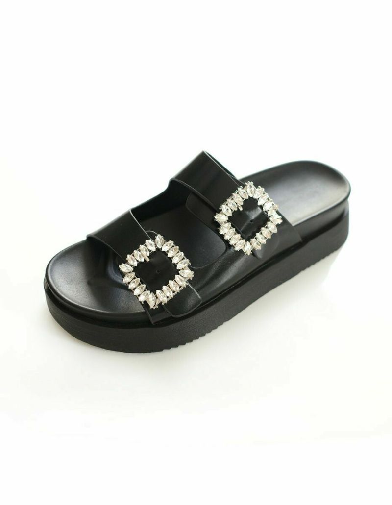 華やかなビジューと大人カジュアルに履けるバックルデザイン