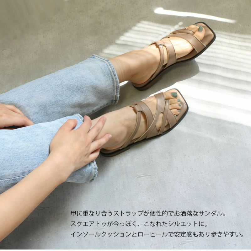 甲に重なり合うストラップが個性的でお洒落なサンダル。